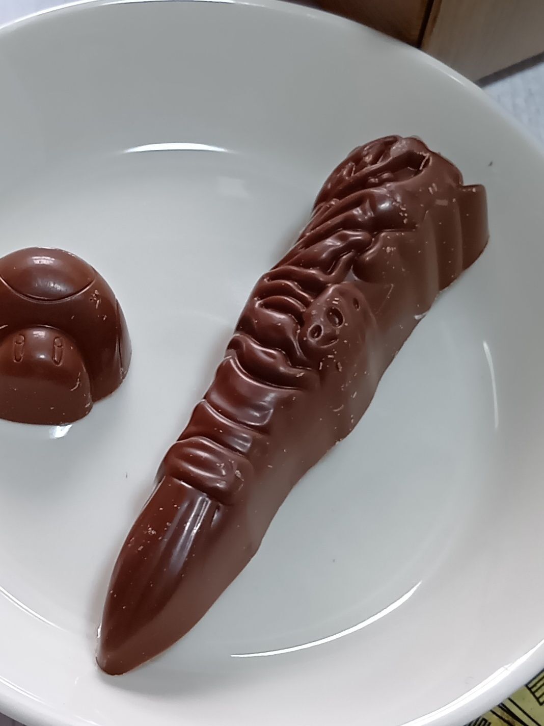 その余韻のまま、続いて話題の両面宿儺の指チョコをお味見。先にキノピオチョコのしっかりした甘さを感じていたため、最初は甘さが控えめに感じましたが、実際にはこちらもしっかり甘く、完成度の高い美味しいチョコでした。