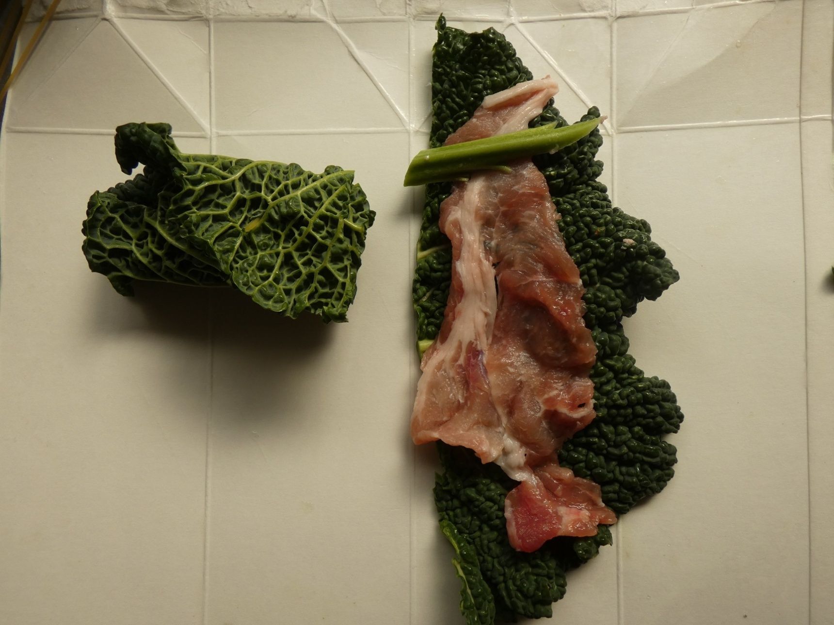 キャベツに豚肉とそぎ落とした部分を乗せて巻き、巻き終わりをパスタで止めます。