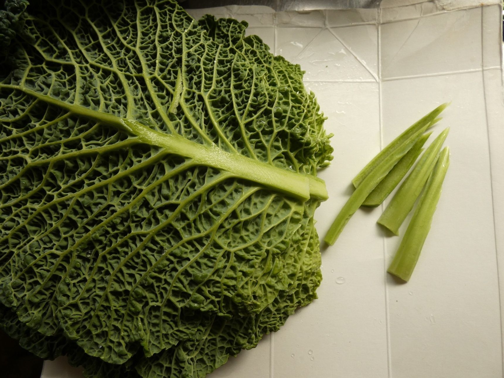 キャベツの白い部分をそぎ切りにし、葉は横に3~4等分に切ります。
