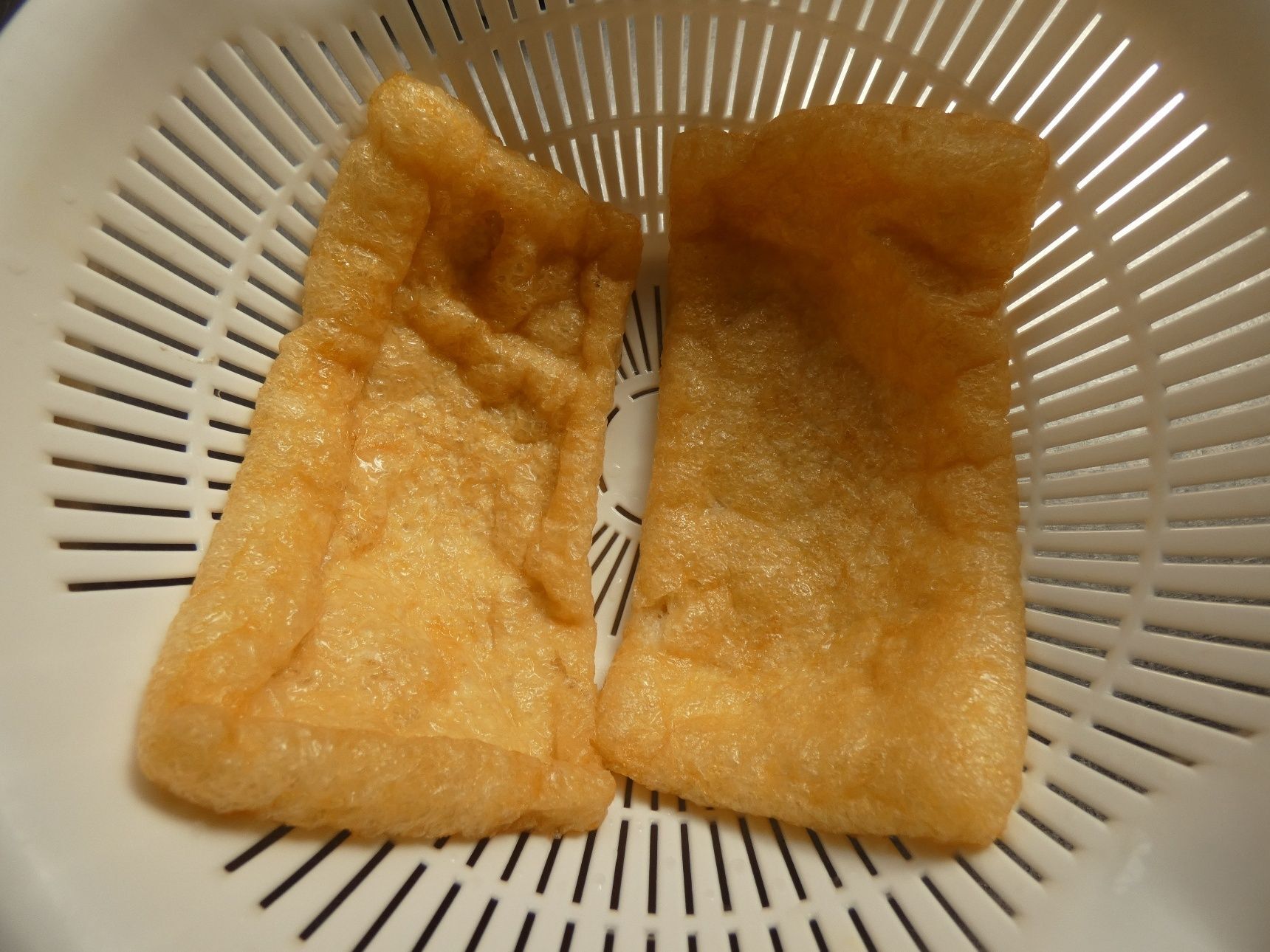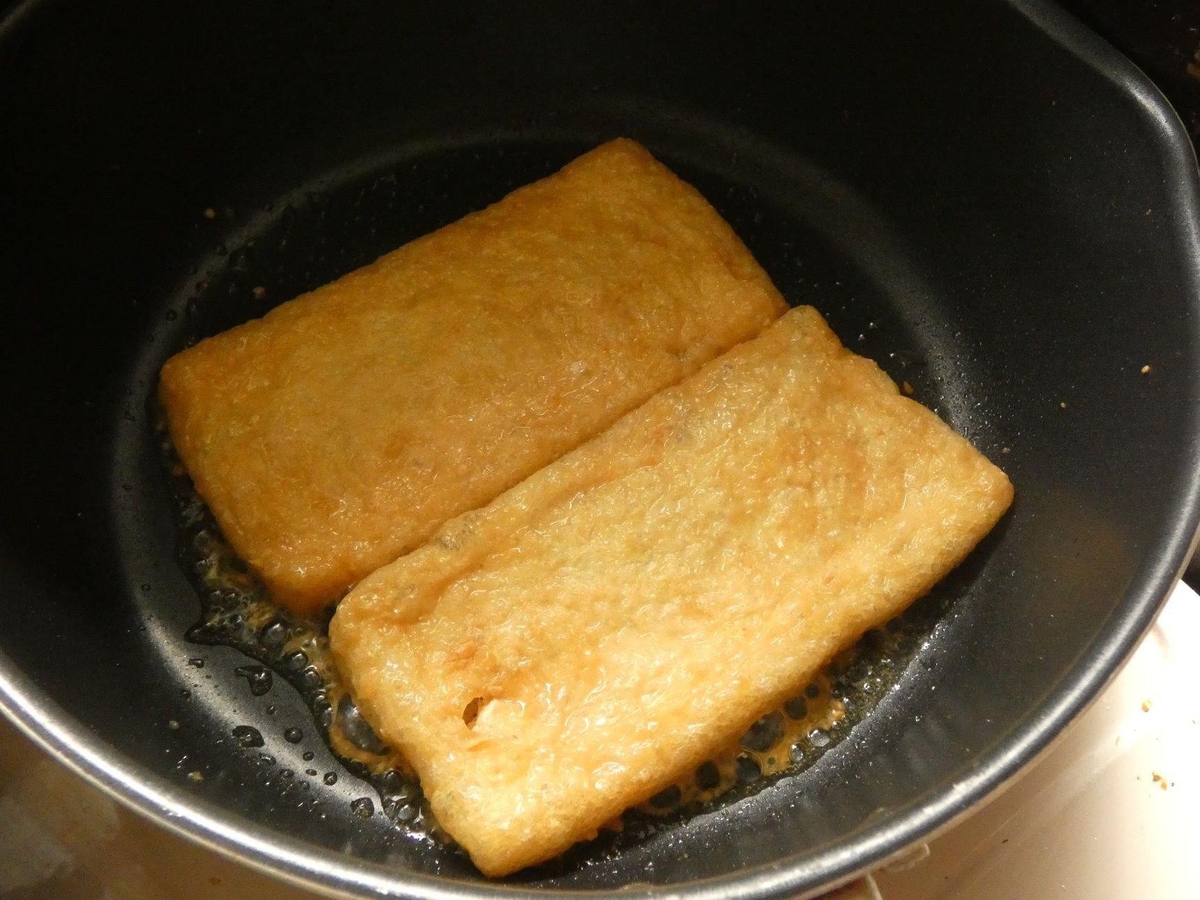 ポリ袋に水とみりん、味噌を混ぜ合わせます。水気をしっかり切った油揚げを入れ、15分くらい漬け込みます。
