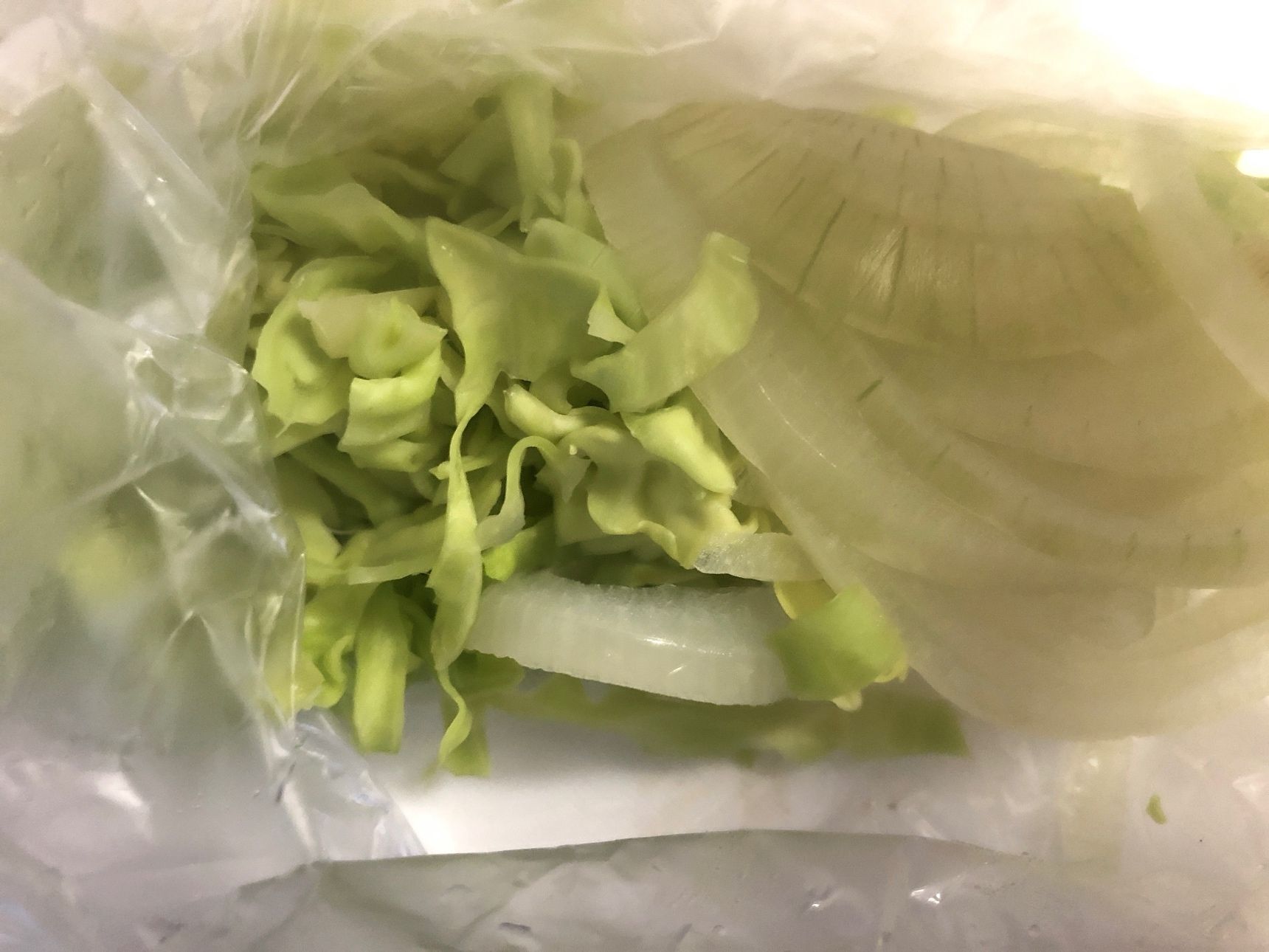 キャベツは千切りに、玉ねぎは繊維を断つように薄切りにします。