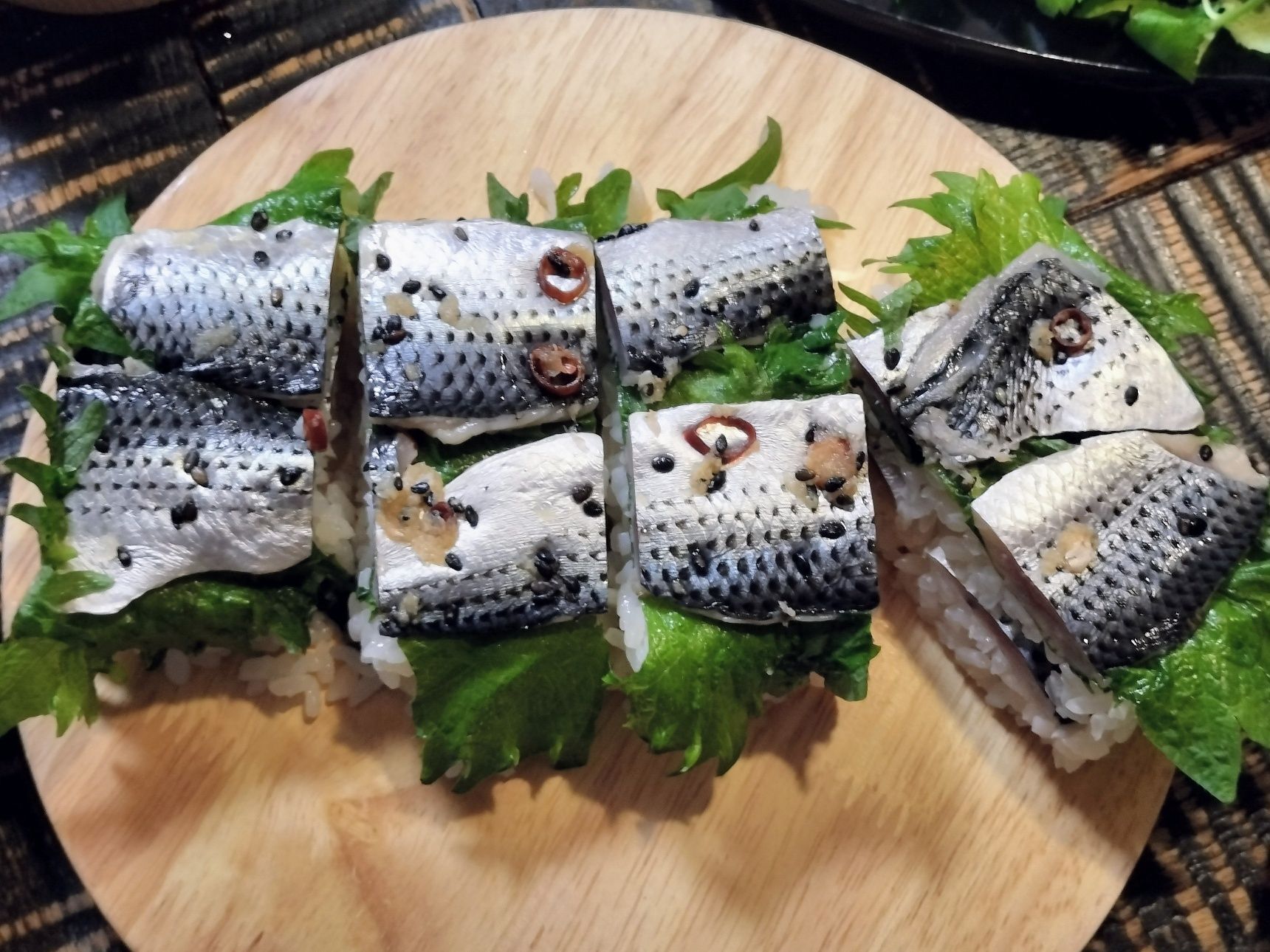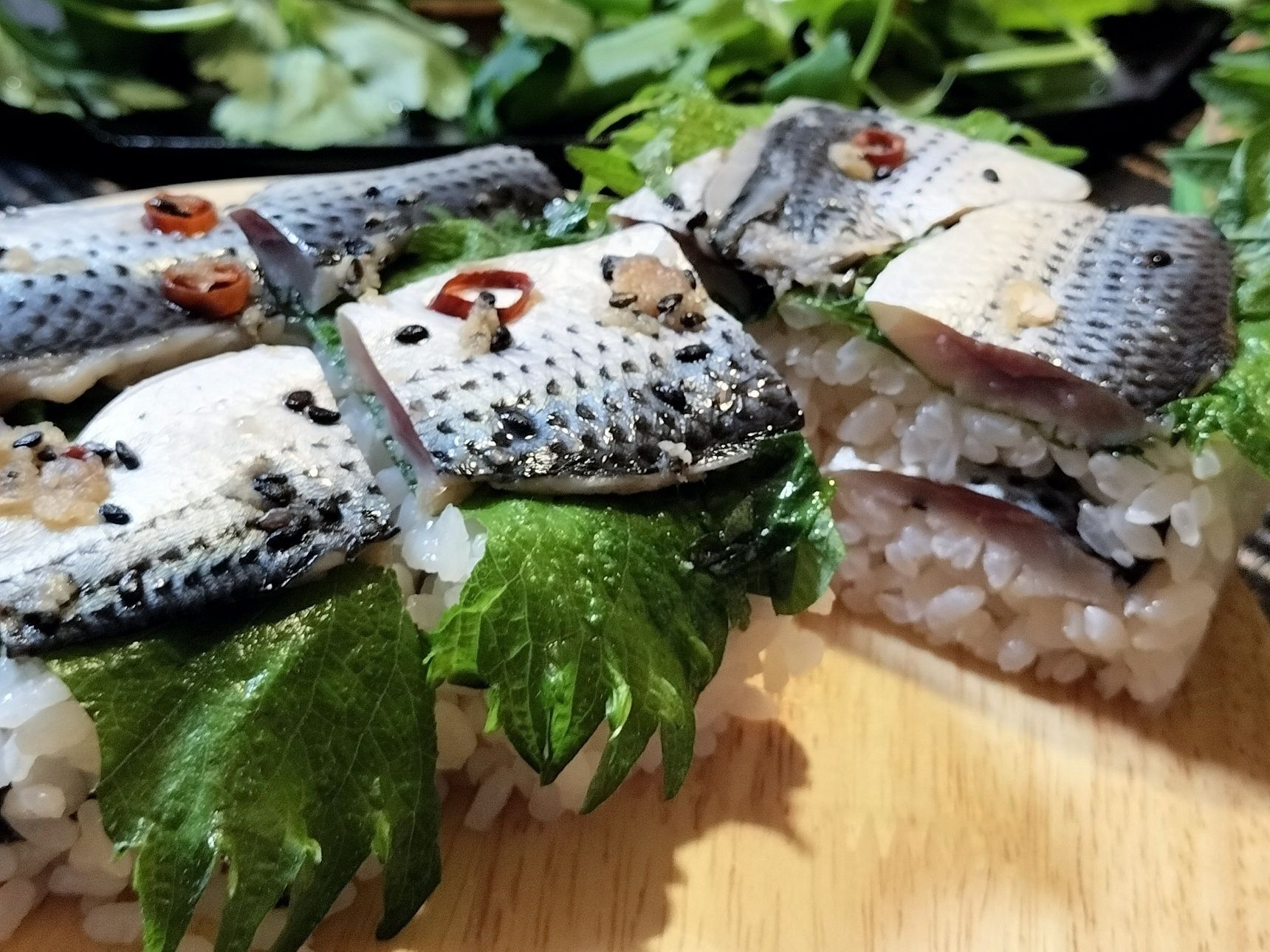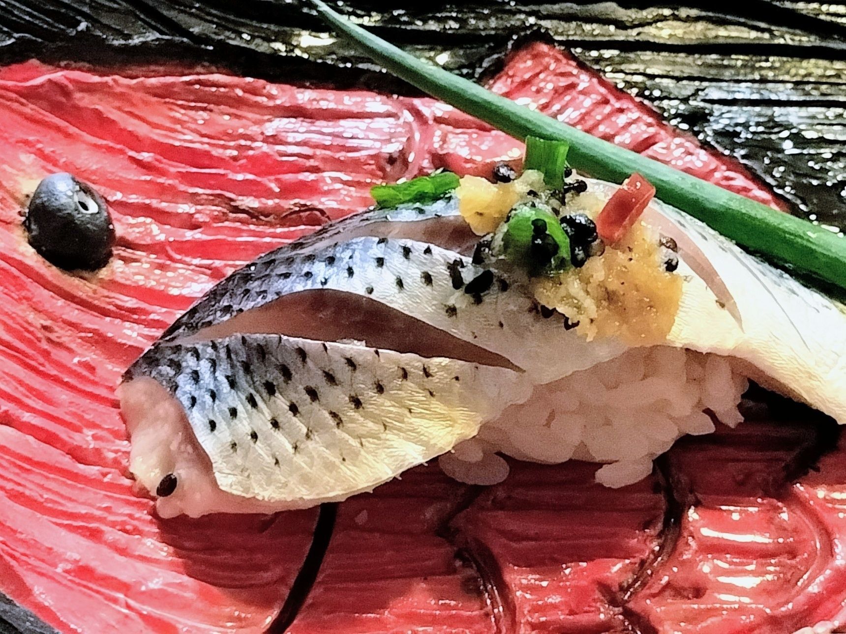 7. 酢飯を握る→切り込みを入れたコノシロの酢締めをのせる→手順3の生姜・ごま・輪切り唐辛子と小ネギを添える【握り寿司 完成】