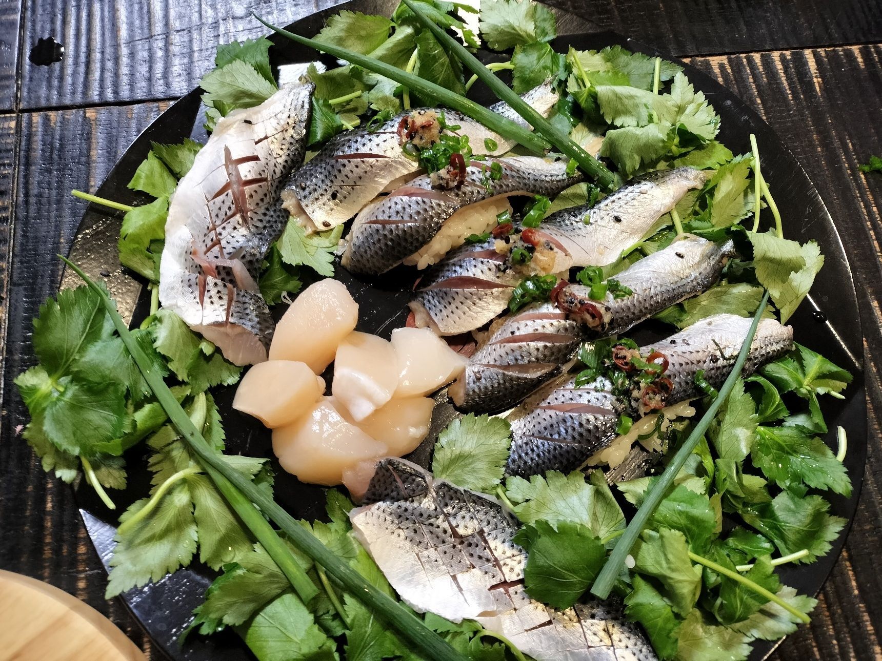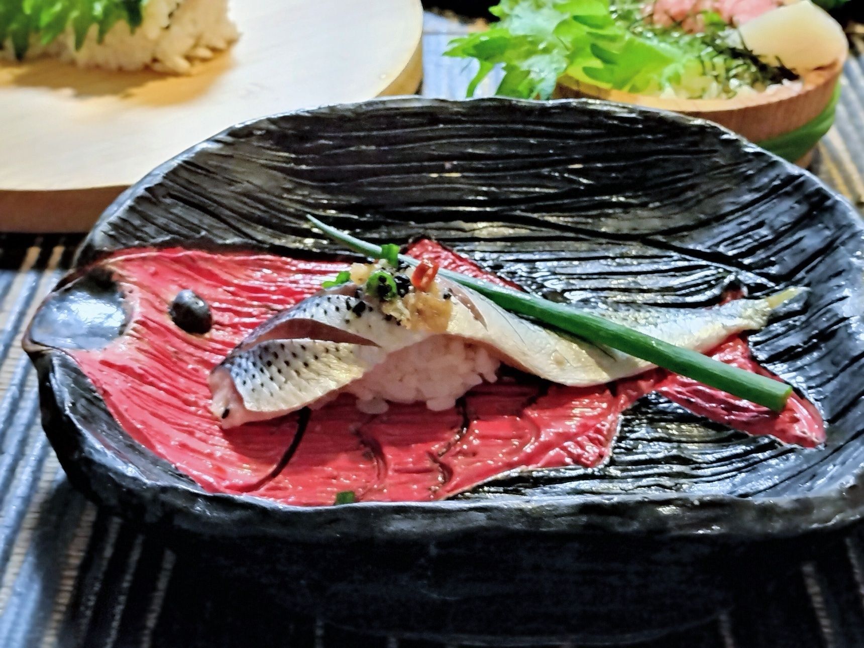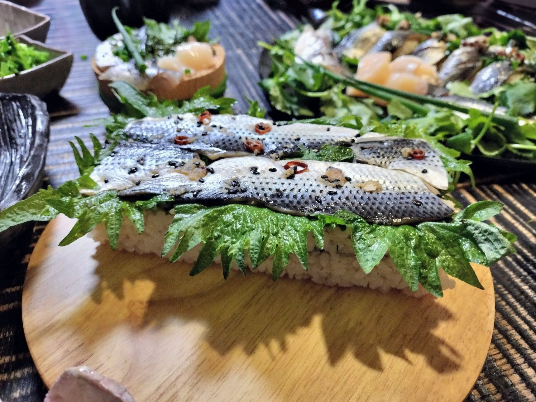 7. 酢飯を握る→切り込みを入れたコノシロの酢締めをのせる→手順3の生姜・ごま・輪切り唐辛子と小ネギを添える【握り寿司 完成】
