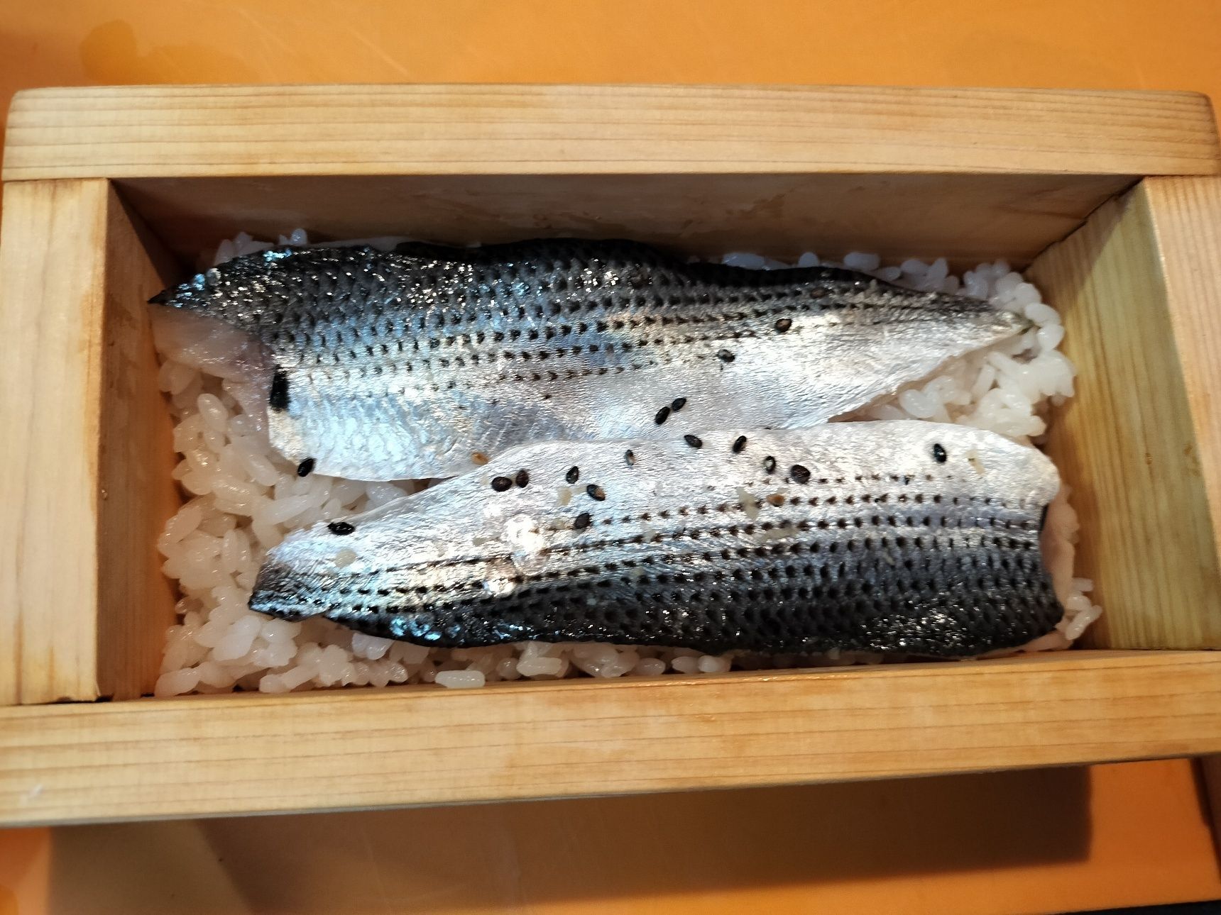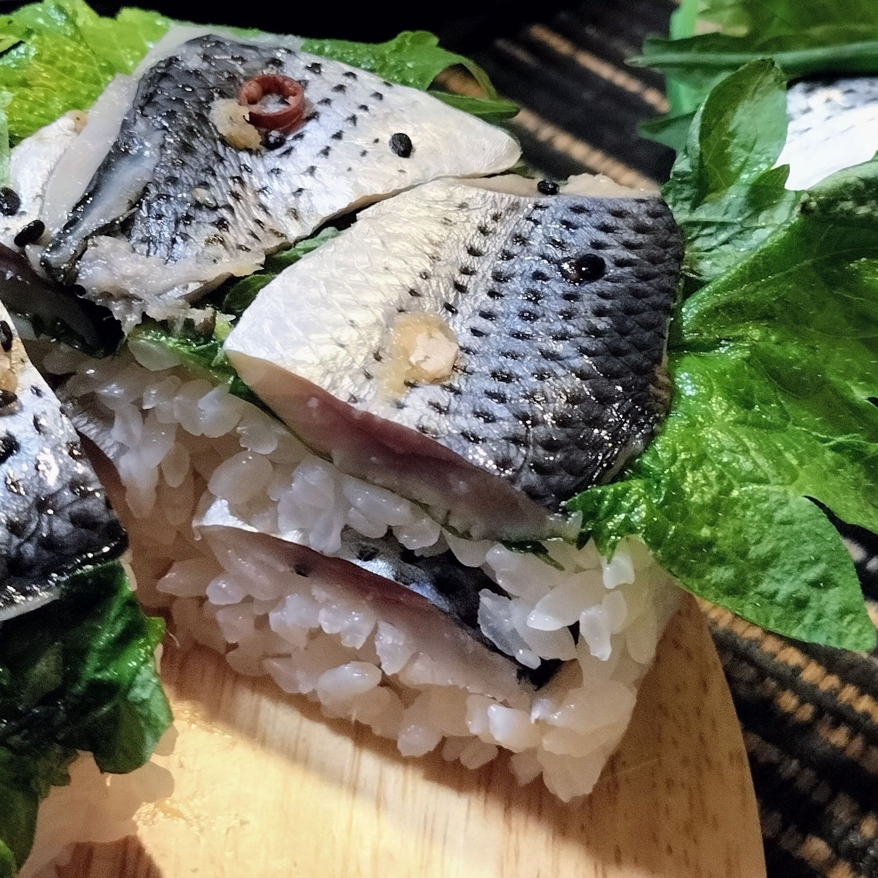 6. 手順3のコノシロの酢締めをのせる→2段目のご飯を詰める→大葉を敷き、コノシロの酢締めをのせる→蓋でしっかりと押す→冷蔵庫で休ませる→木枠を外し、器に盛り付けて切る【押し寿司 完成】