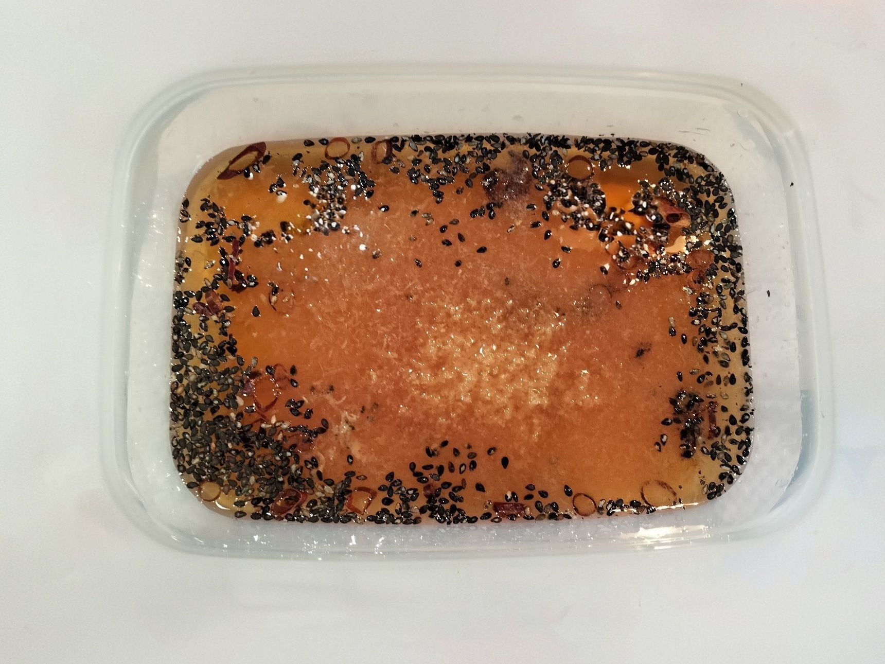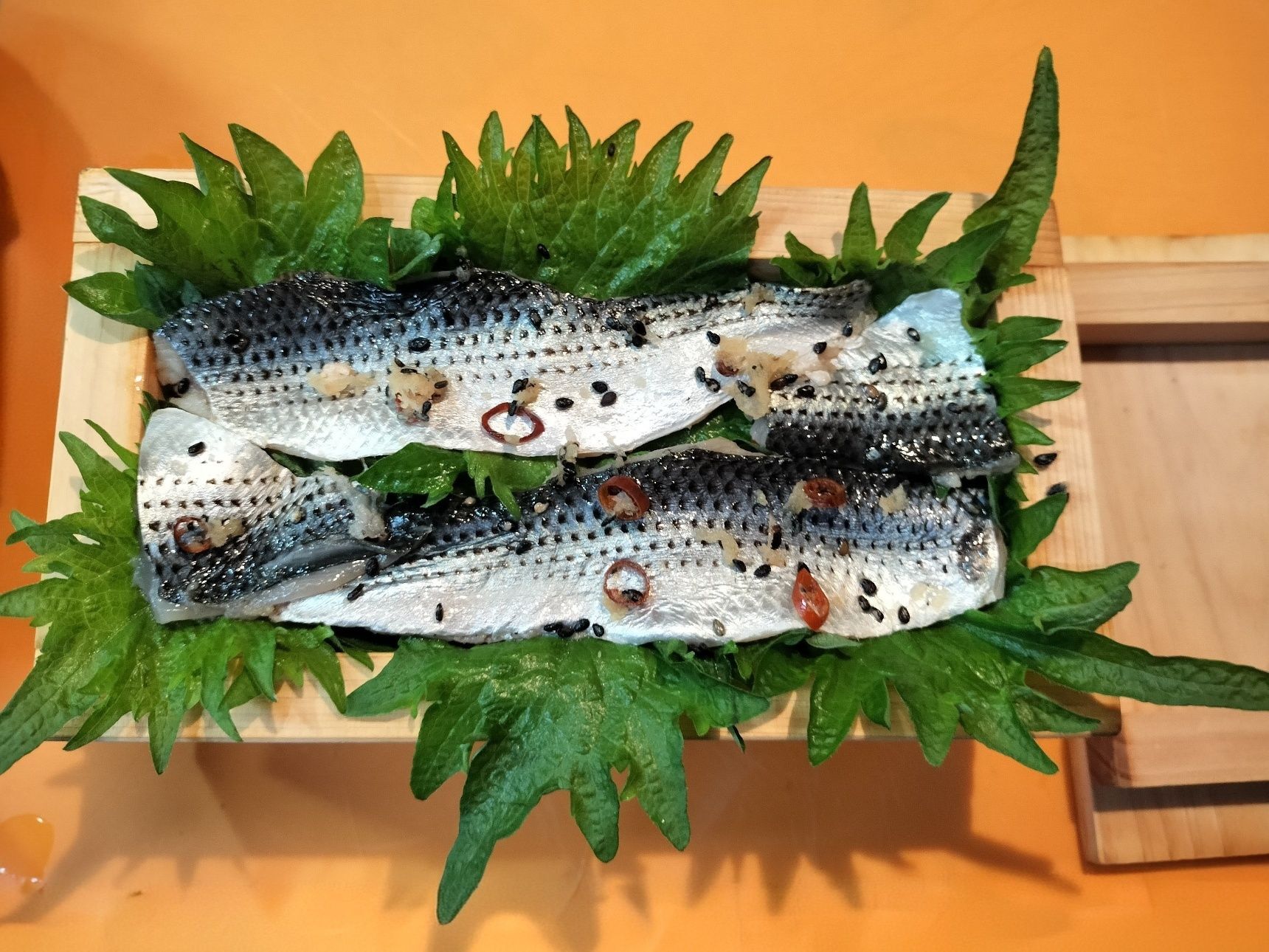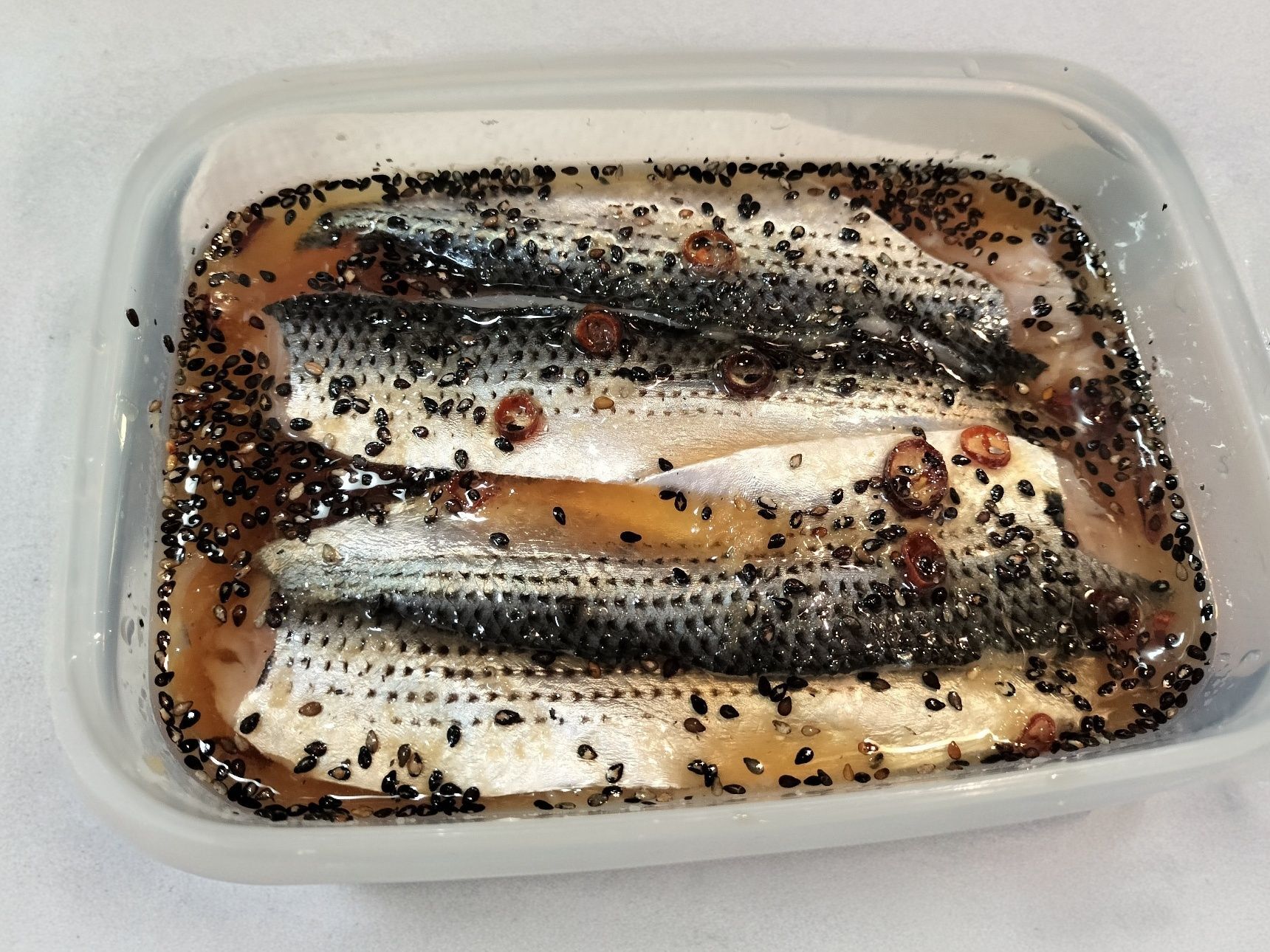 3. 手順1のコノシロ(6尾分)を手順2のタッパーに入れる→蓋をして、冷蔵庫で1時間ほど漬け込む→身を取り出し、漬け汁を拭き取る(漬け込んだ生姜・ごま・輪切り唐辛子も網ですくい、漬け汁を拭き取る)