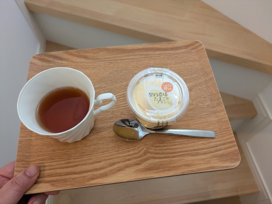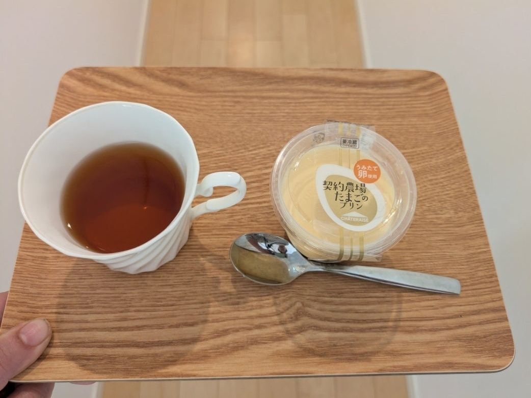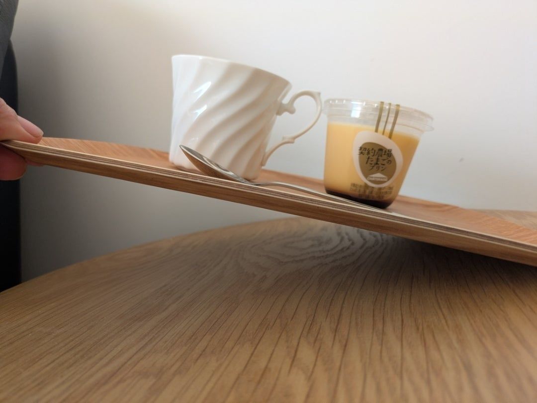 熱々の紅茶が入ったティーカップとプリンがのったトレイを傾けてみました!!本当に滑らない!