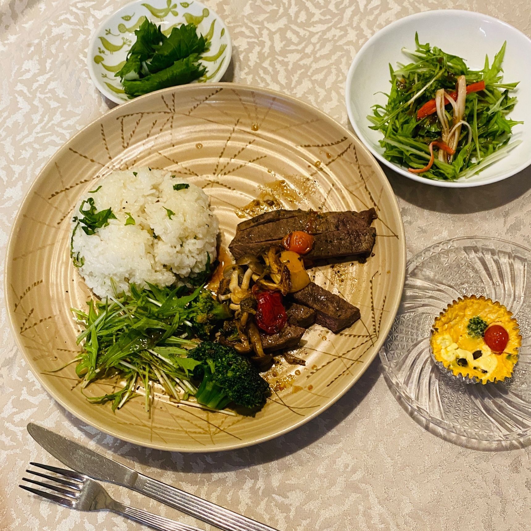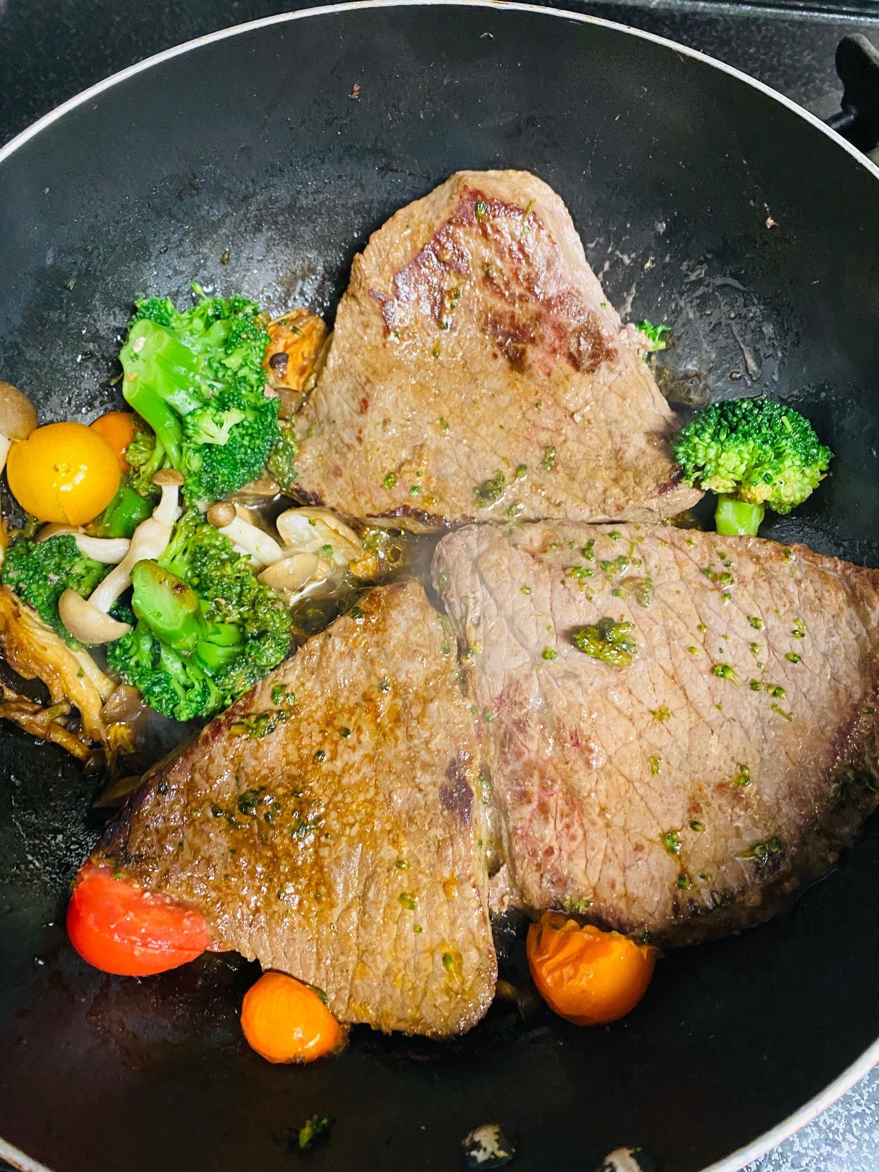 フライパンに、みじん切りにしたにんにく、バターを入れ、大きなフライパンで3人分まとめて、ステーキを焼きました。塩胡椒します。