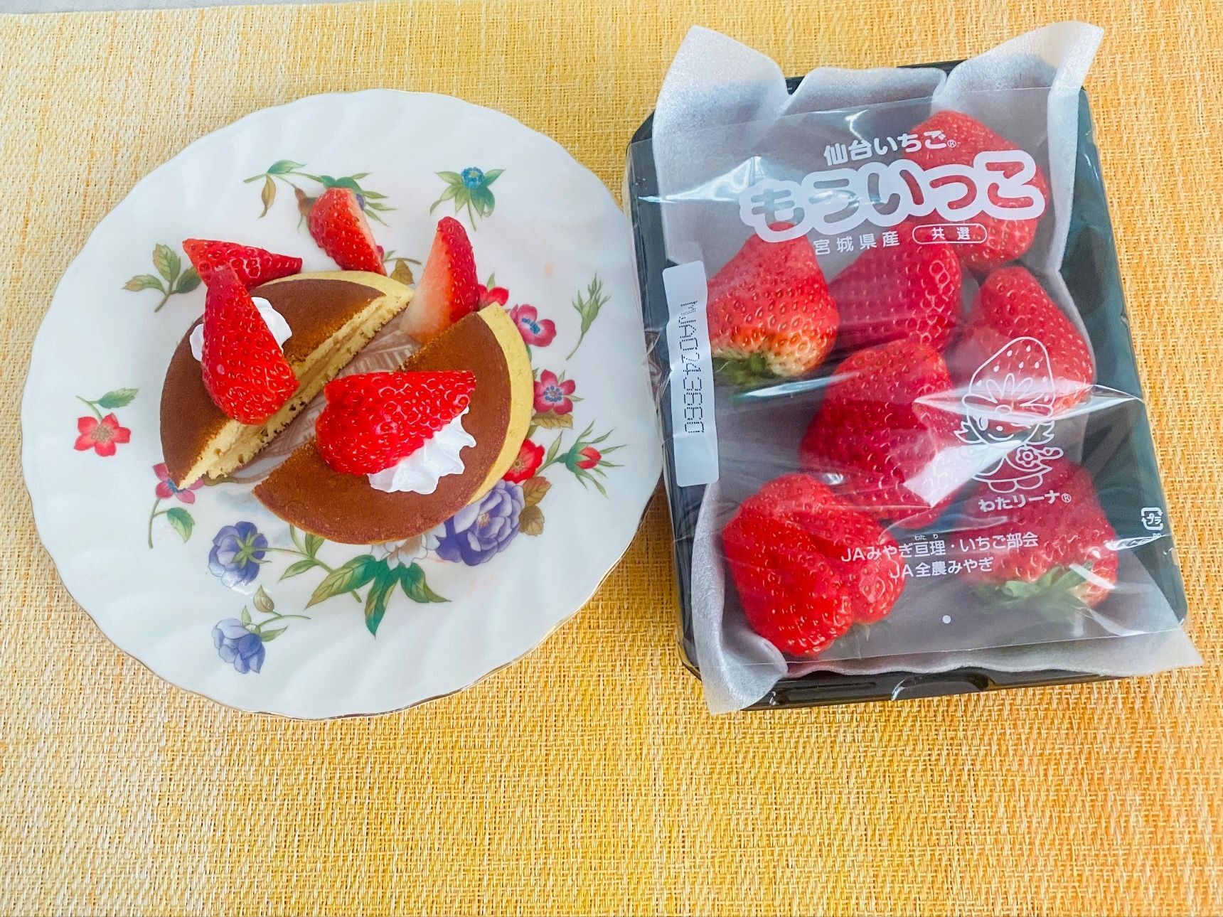 カスタードクリーム入りのどら焼きにデコレーションして4等分にカットして、ようやく1粒の大きさと同じくらいになりました。 食べ応えがあって、甘くて美味しいですよ。 見かけましたら是非〜。おすすめです。