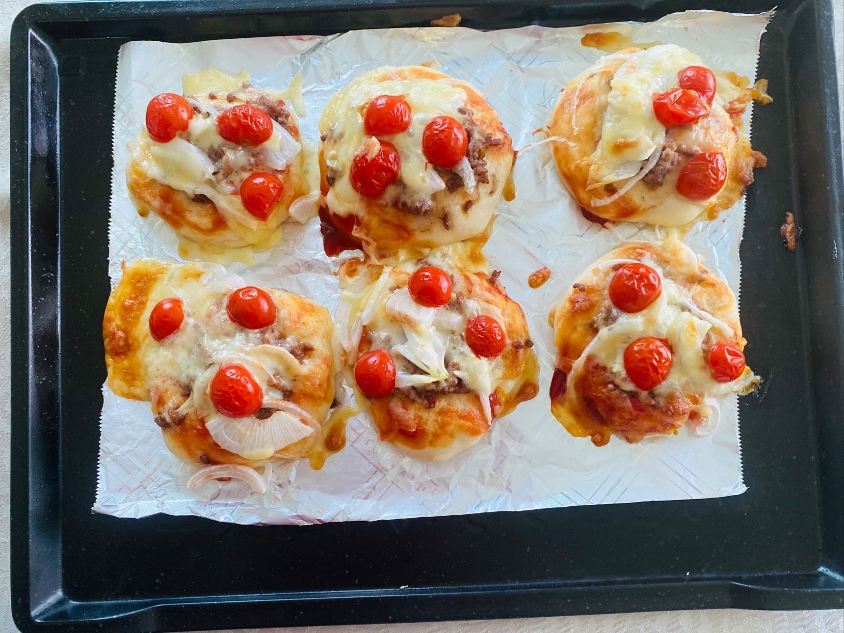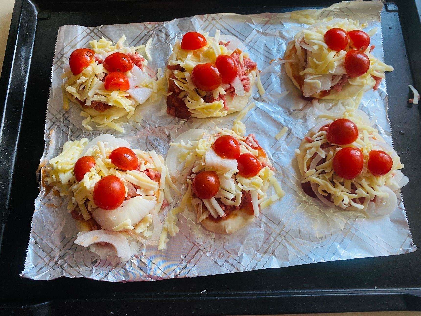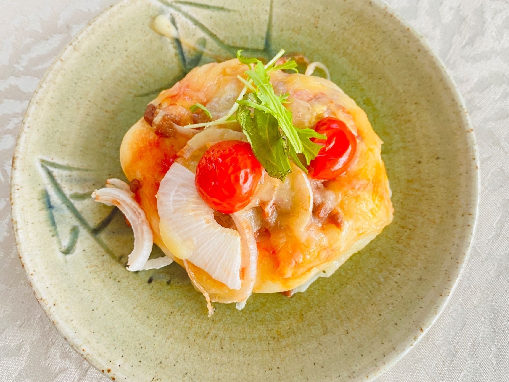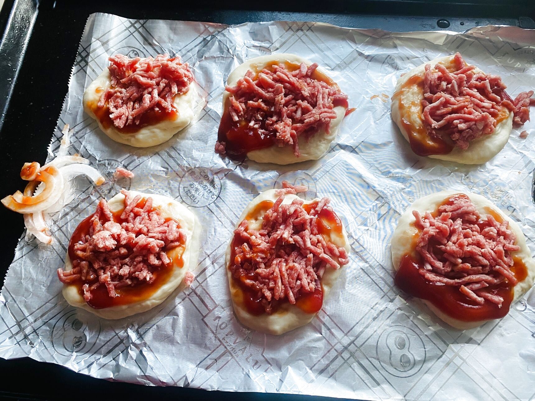 スライスした玉ねぎ、ピザ用チーズをたっぷり乗せます。
