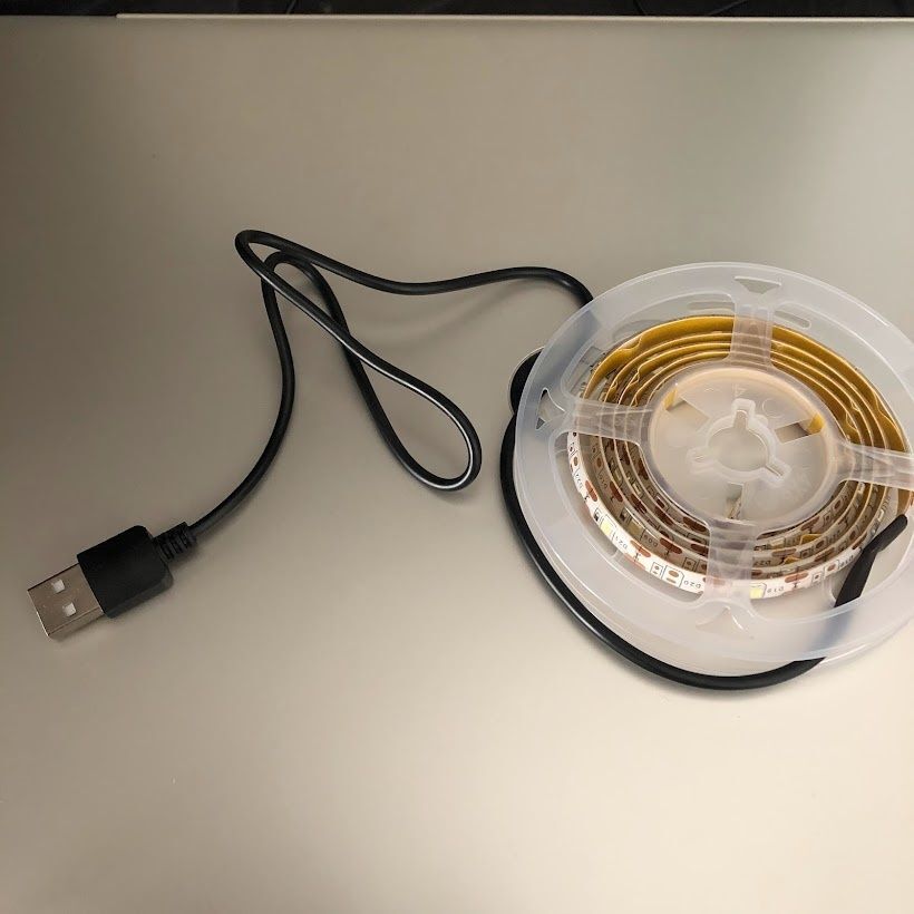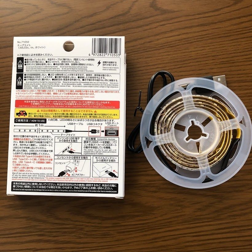 ダイソーのテープライトは、USB電源で手軽に使えるLED照明です。裏面に両面テープ付きで、カットラインに合わせて長さを調整可能です。
