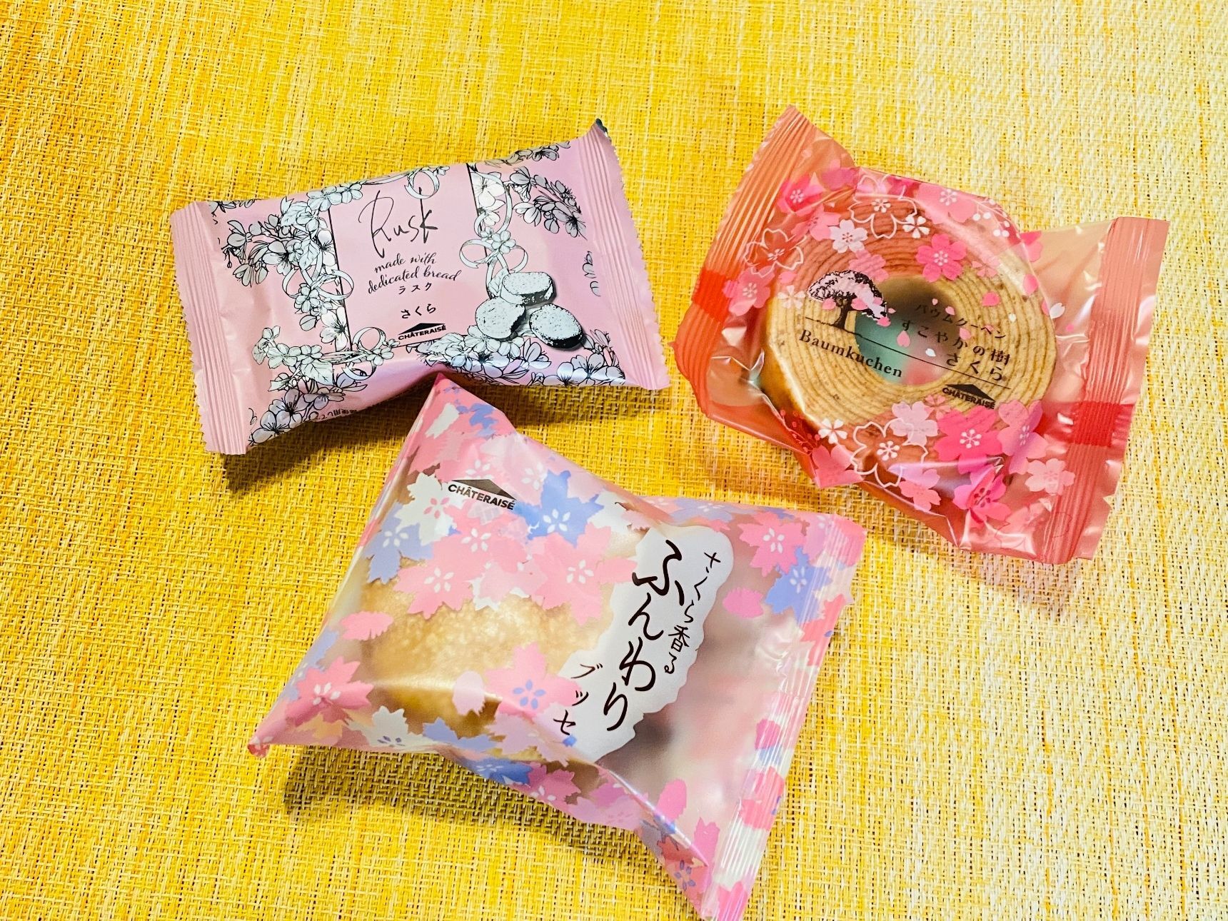 さくら香るふんわりブッセ140円(税込)、ティータイムブレッド 春のさくら108円(税込)サクサクのラスクです。