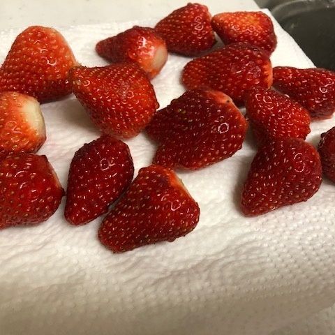 いちごを洗って、縦半分に切ってペーパータオルの上で水分を切ります。