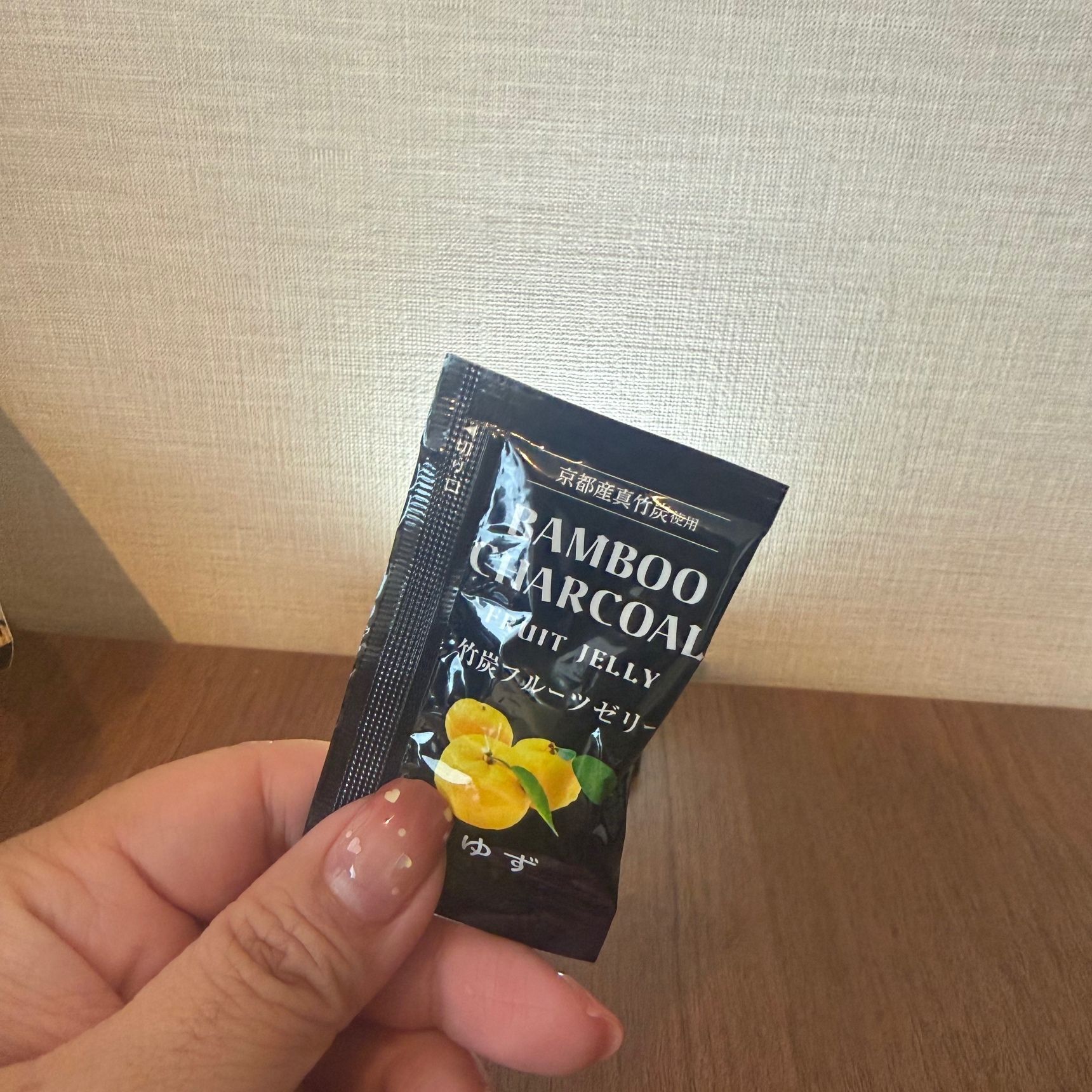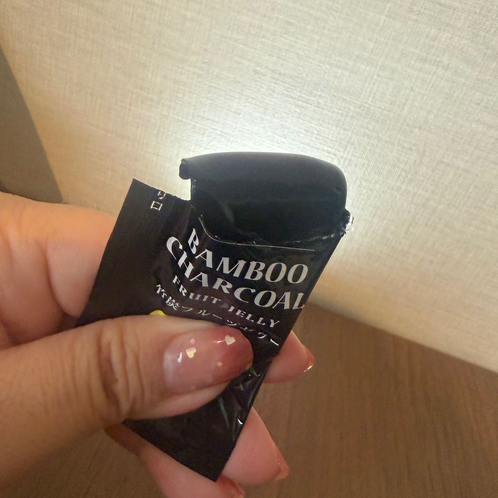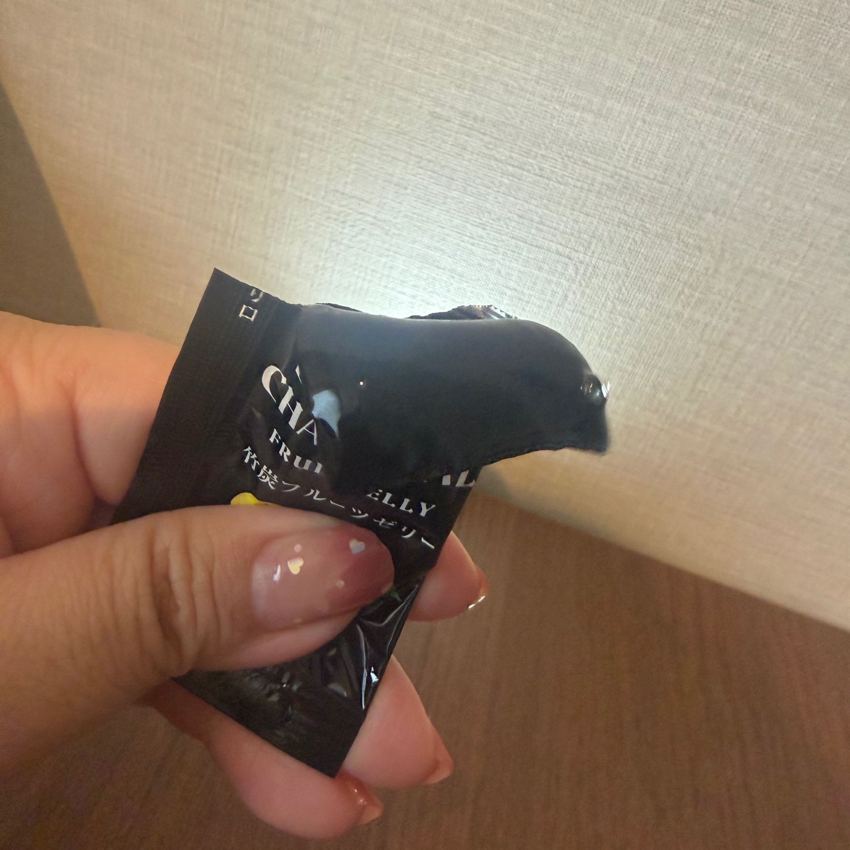 本当に真っ黒ですが、味はきちんとフルーツの味。ゼリーはぷるんとしていますが、竹炭由来の成分なのかシャリっと感もあります。