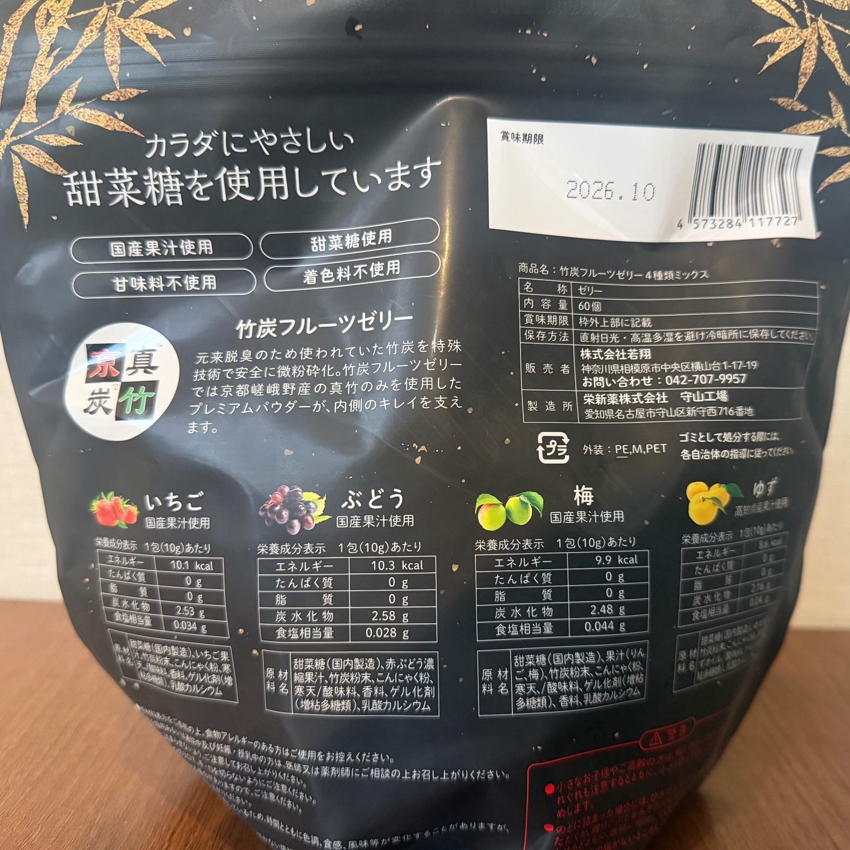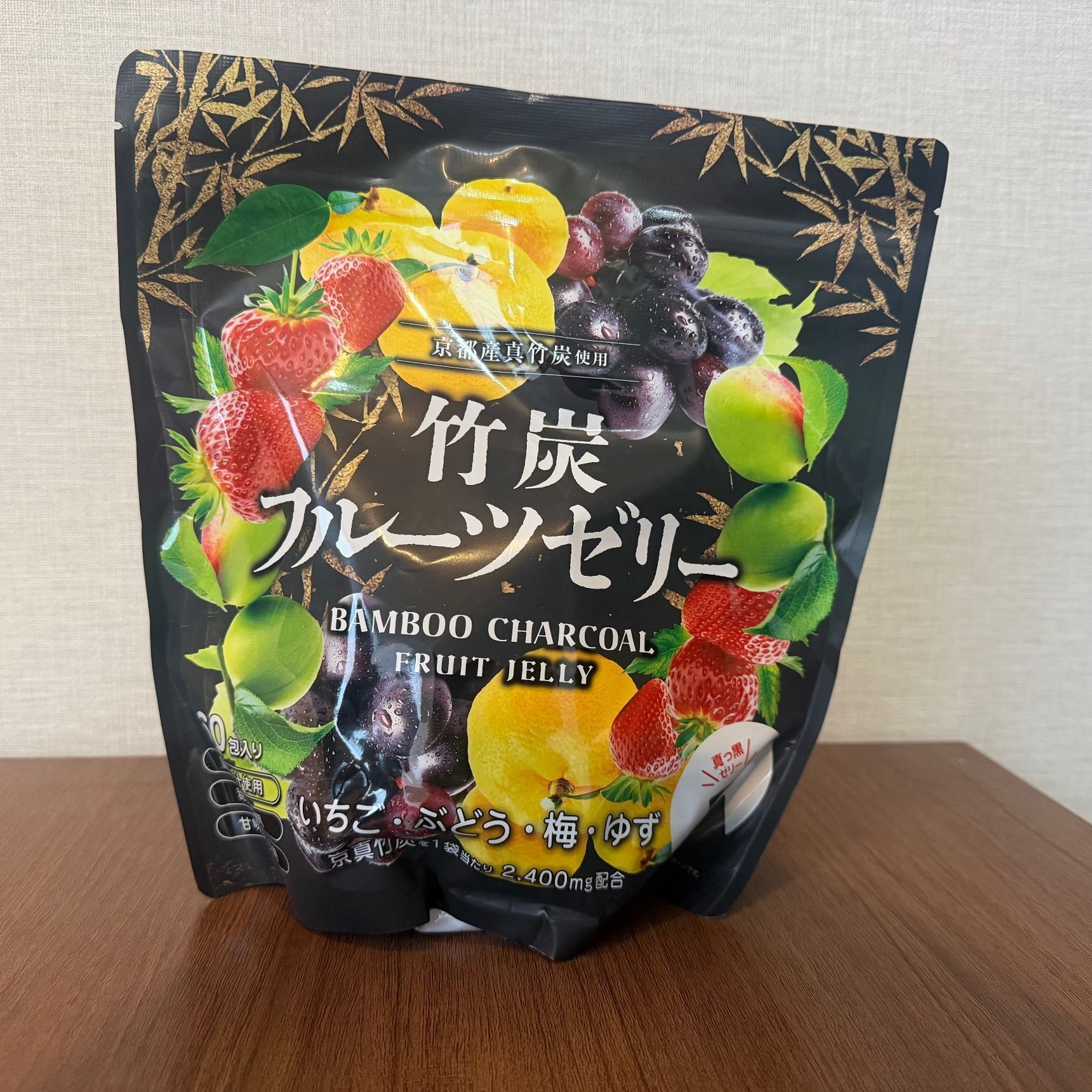 竹炭のフルーツゼリーが4種(いちご・ぶどう・梅・ゆず)が15 包ずつ入っています。