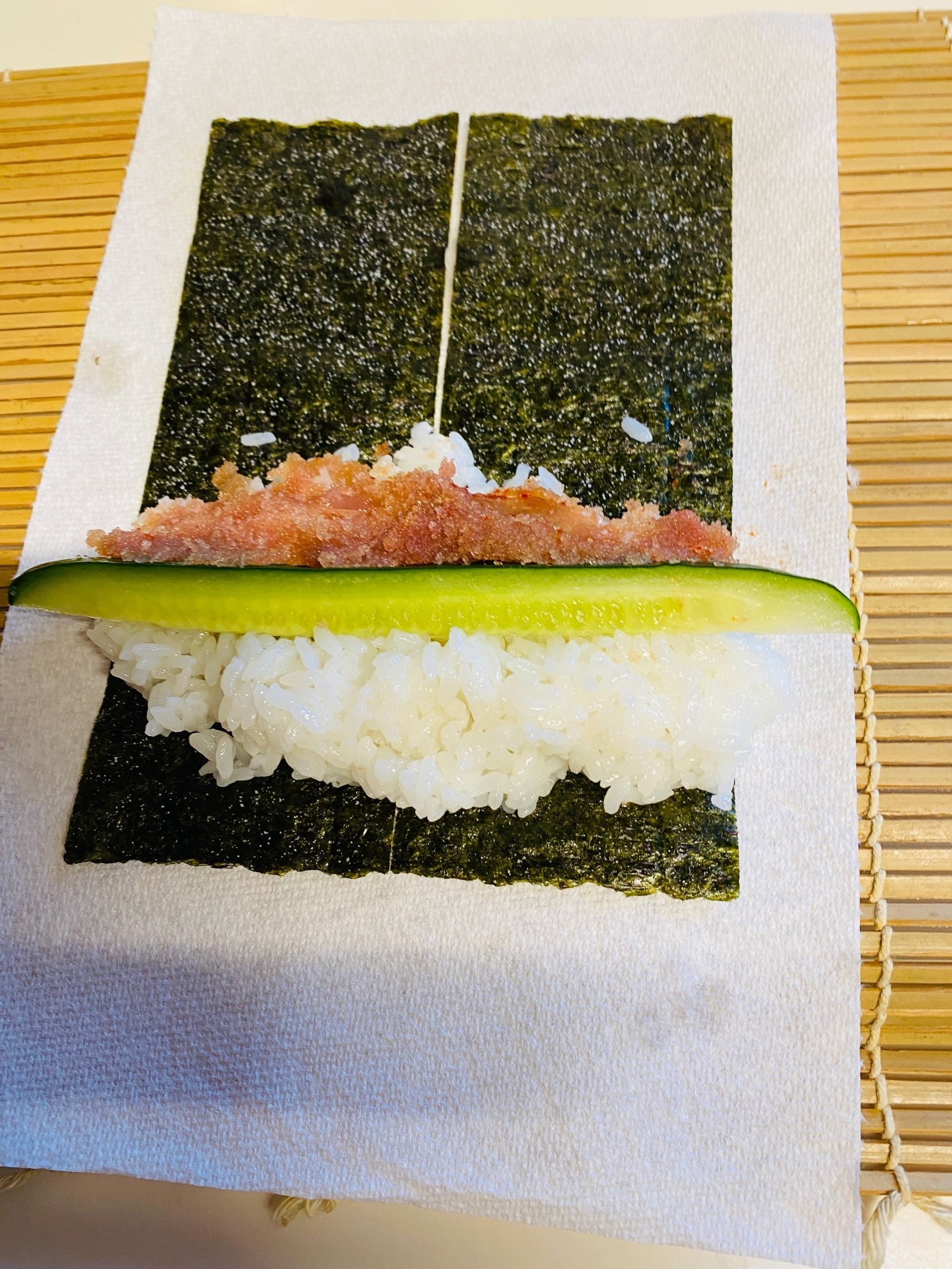 まきすにキッチンペーパーをのせ、海苔をおいて、酢飯、細切りきゅうり、明太子をたっぷり乗せます。くるっと巻きます。落ち着かせます。
