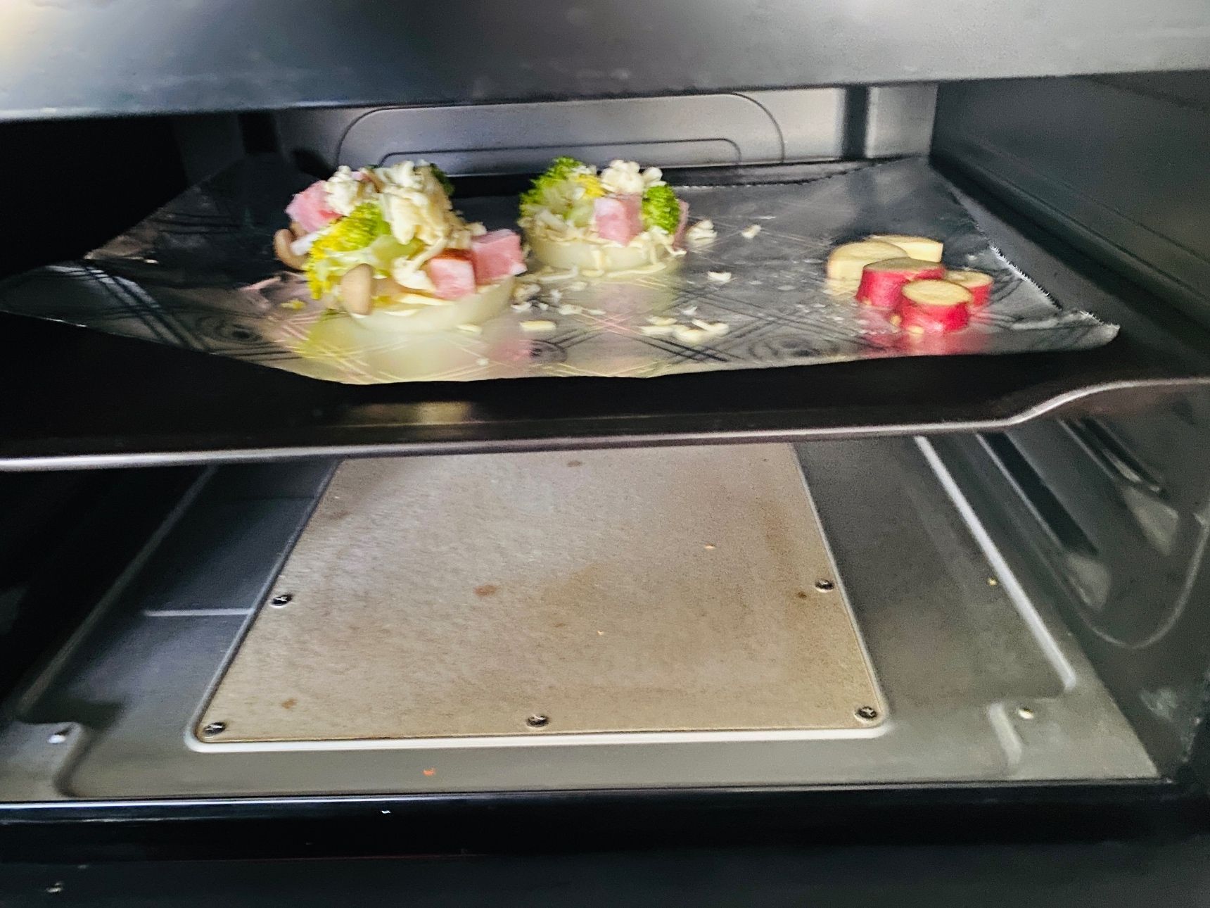 輪切りにしたさつまいもは、乗り切らなかったので、空いているスペースで焼いてから、トッピングしました。一緒に乗せてもかまいませんよ。