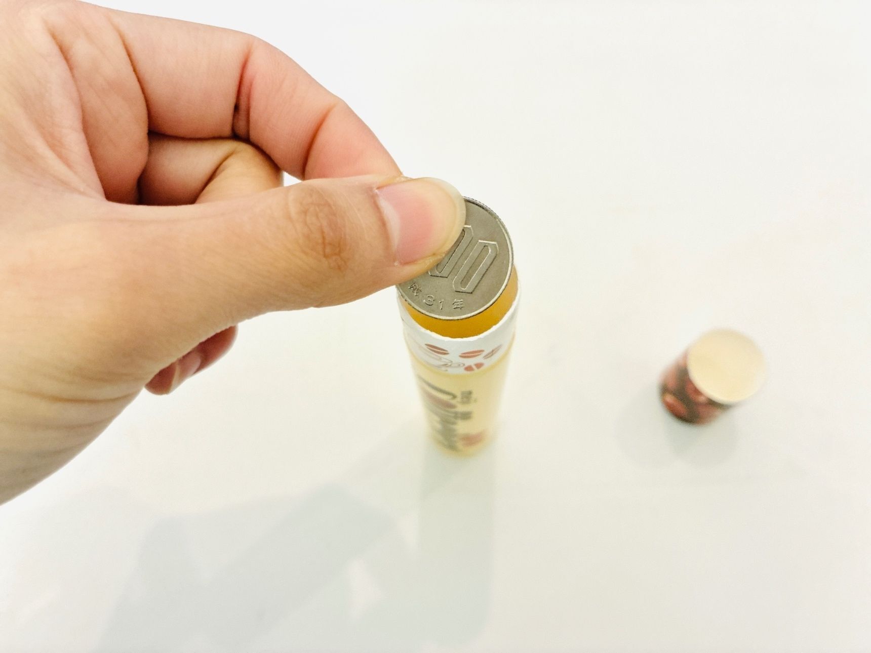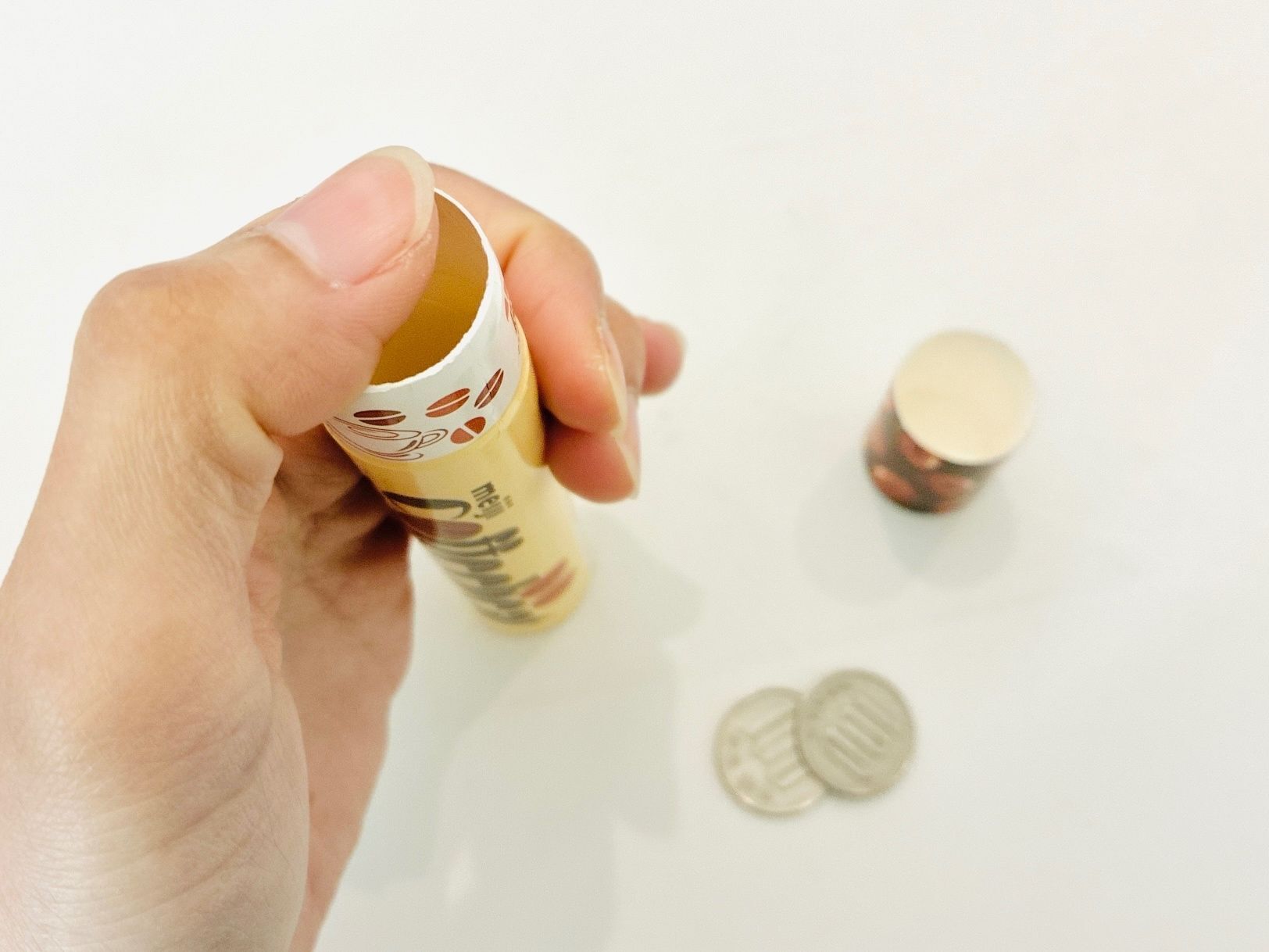 100円玉の重さで、空き箱と勘違いされて捨てられることはなさそうですが、お菓子と思って手に取ってしまうとガッカリ(笑)。