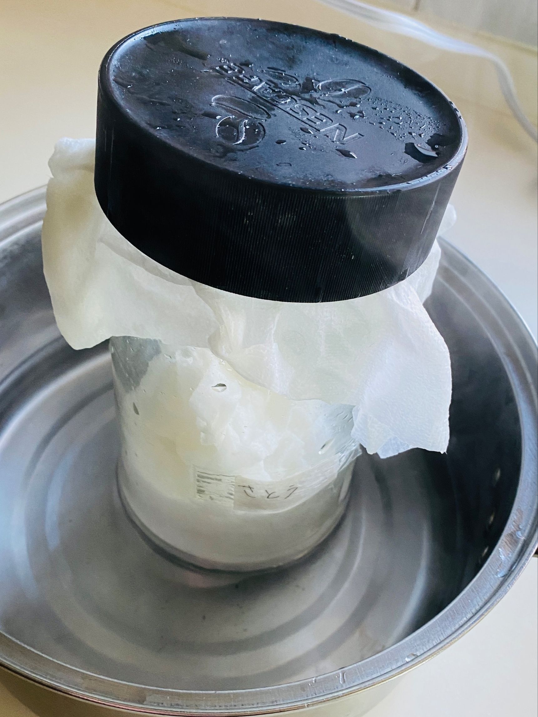 まず、固まった砂糖に水で固く絞ったキッチンペーパーを被せたまま蓋をします。