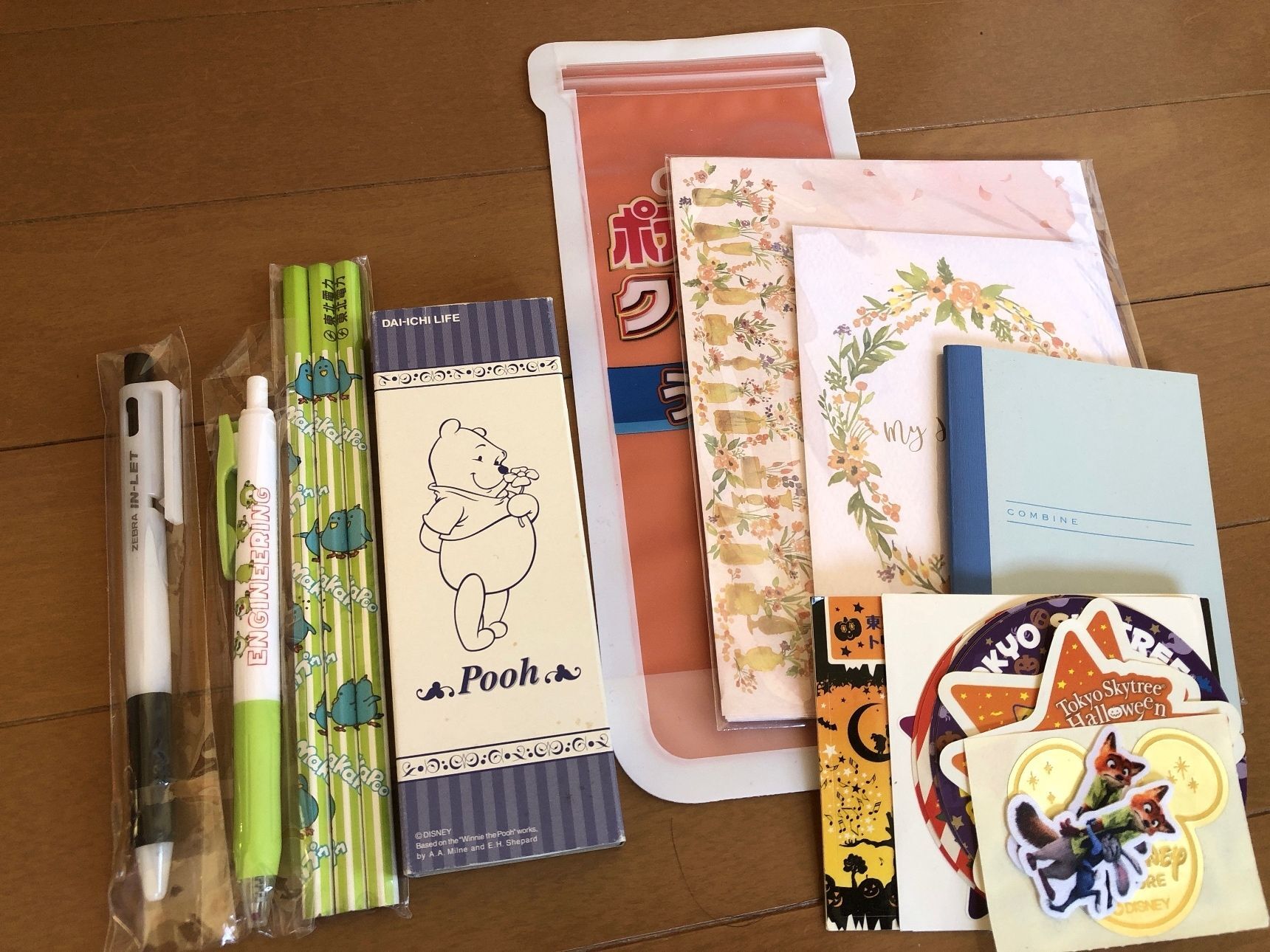 ボールペンなどの筆記具、ミニノート、シール、チャック付き袋。