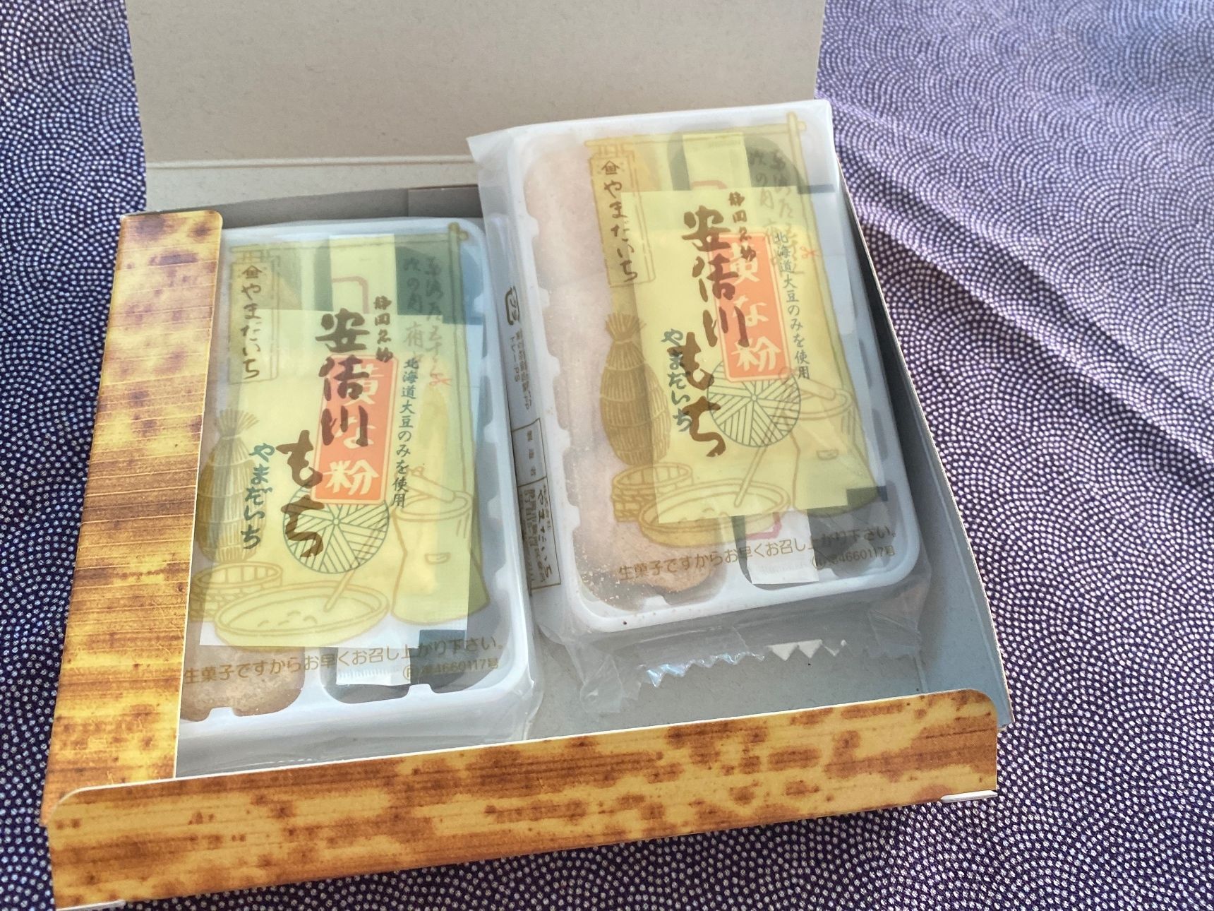 1パックに、一口サイズの安部川もちが6個入っています。きな粉味と北海道こし餡の2種類各3個となっています。同封の黄粉をたっぷりかけてお召し上がり下さい。