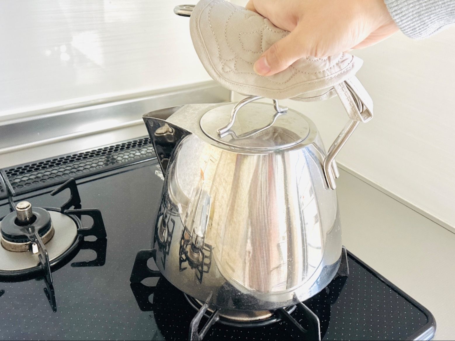 我が家のヤカンは、持ち手が熱くなるタイプ。