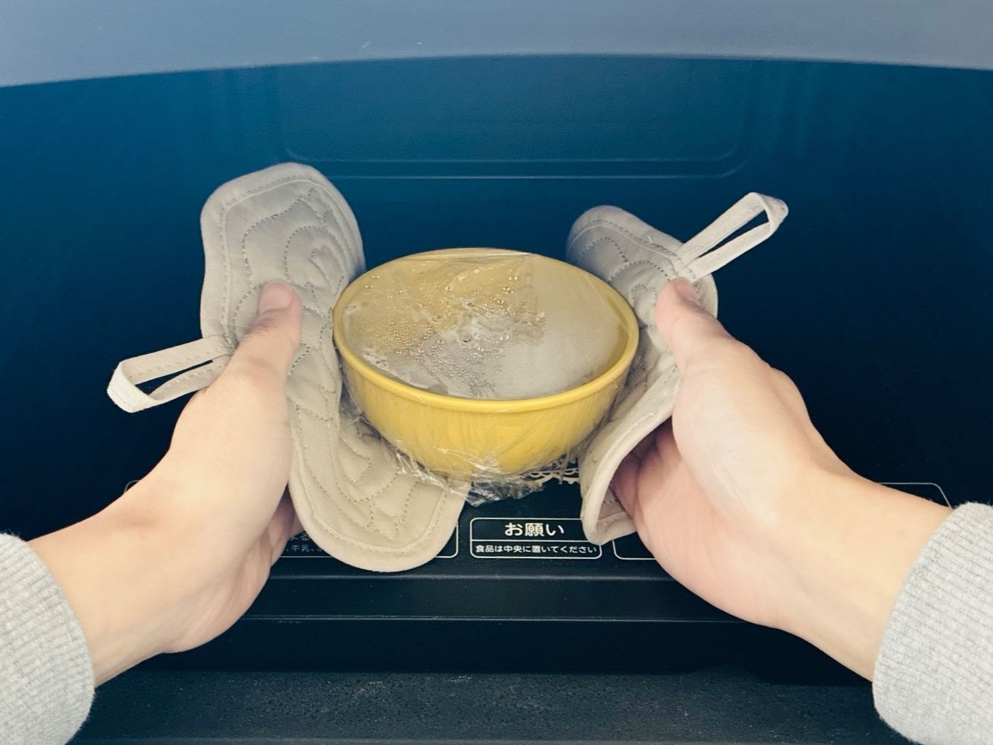 レンチンで熱くなった器を取り出す際には、2枚を使ってこのとおり。