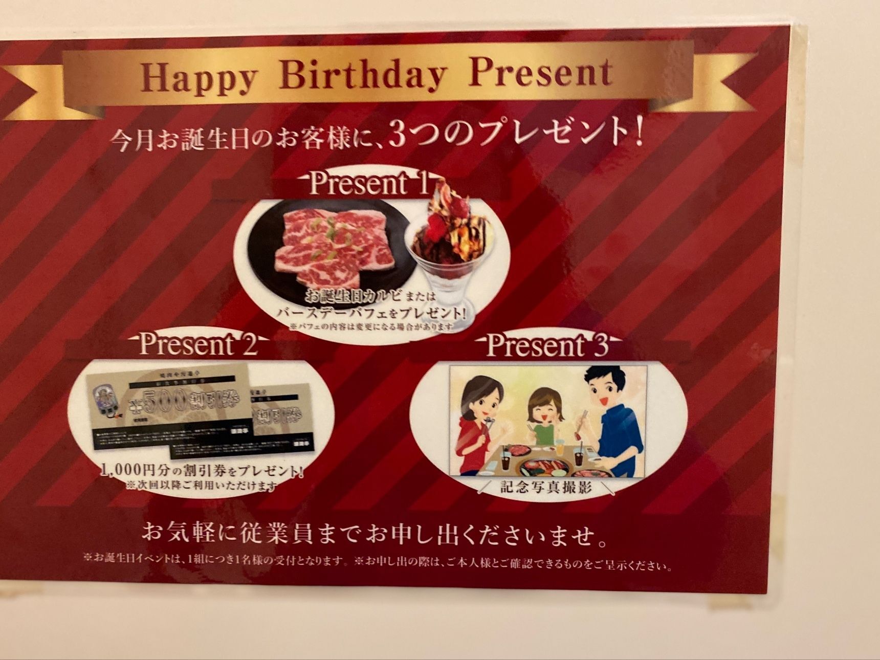 お誕生日月の方に必見!カルビまたはバースデーパフェ、次回使える1000円割引券、記念写真撮影付きです。