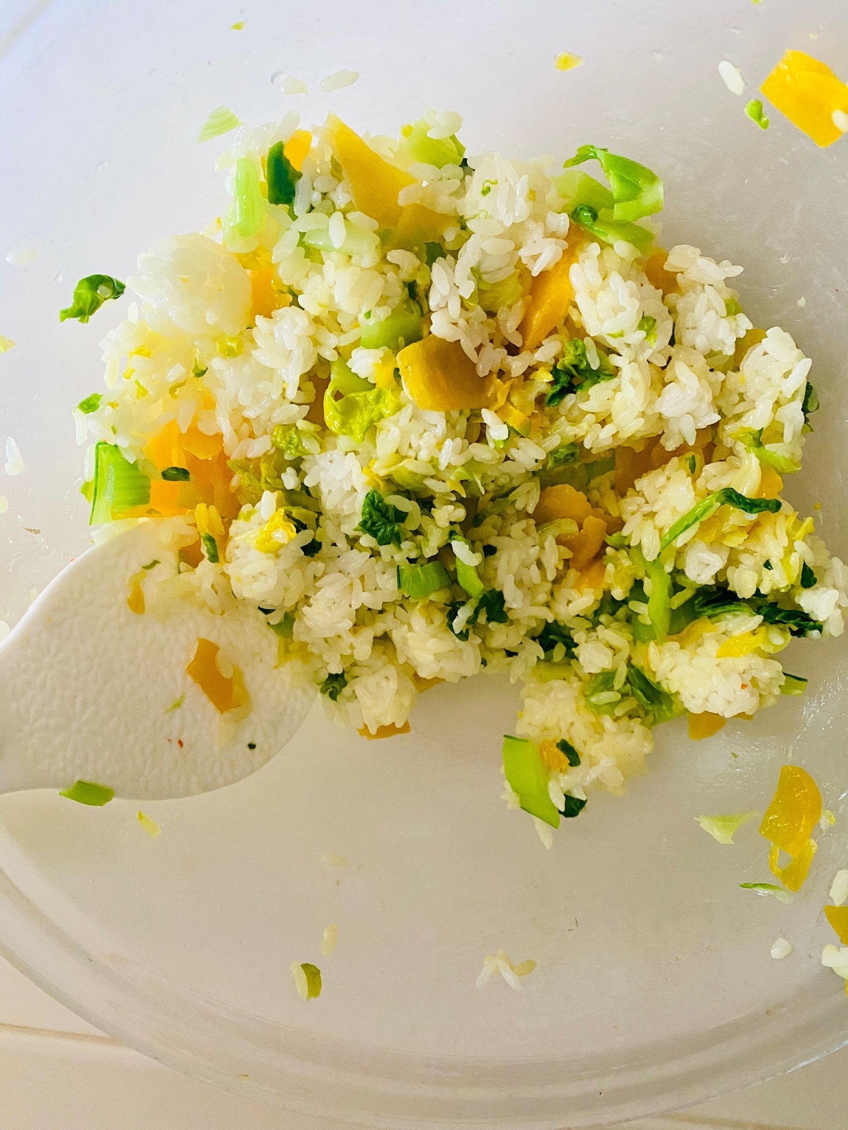 細く切ったたくあん、炒り卵、薄皮をとった明太子を混ぜます。