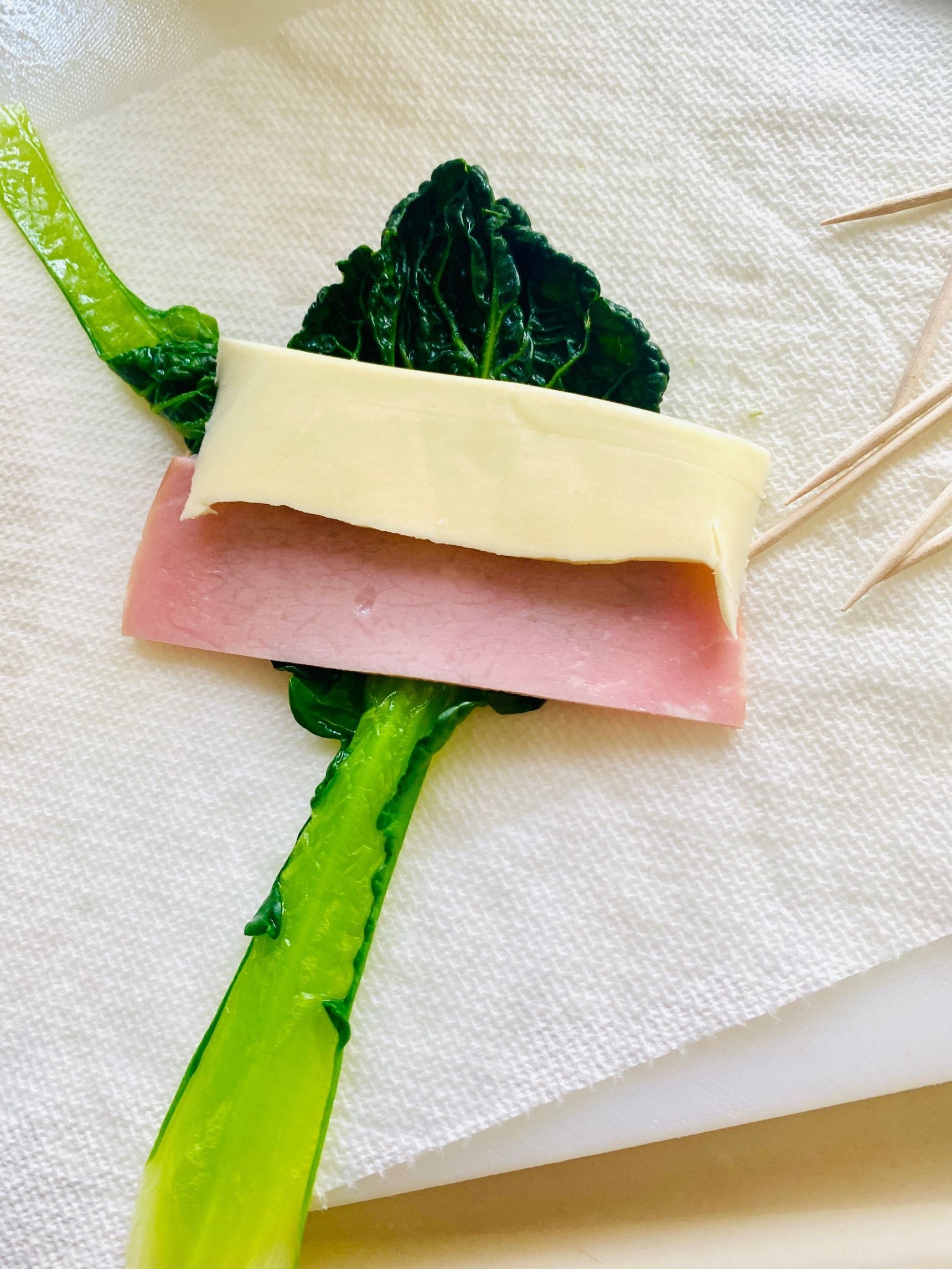 ハム、チーズを半分に切って、葉の先から巻きます。