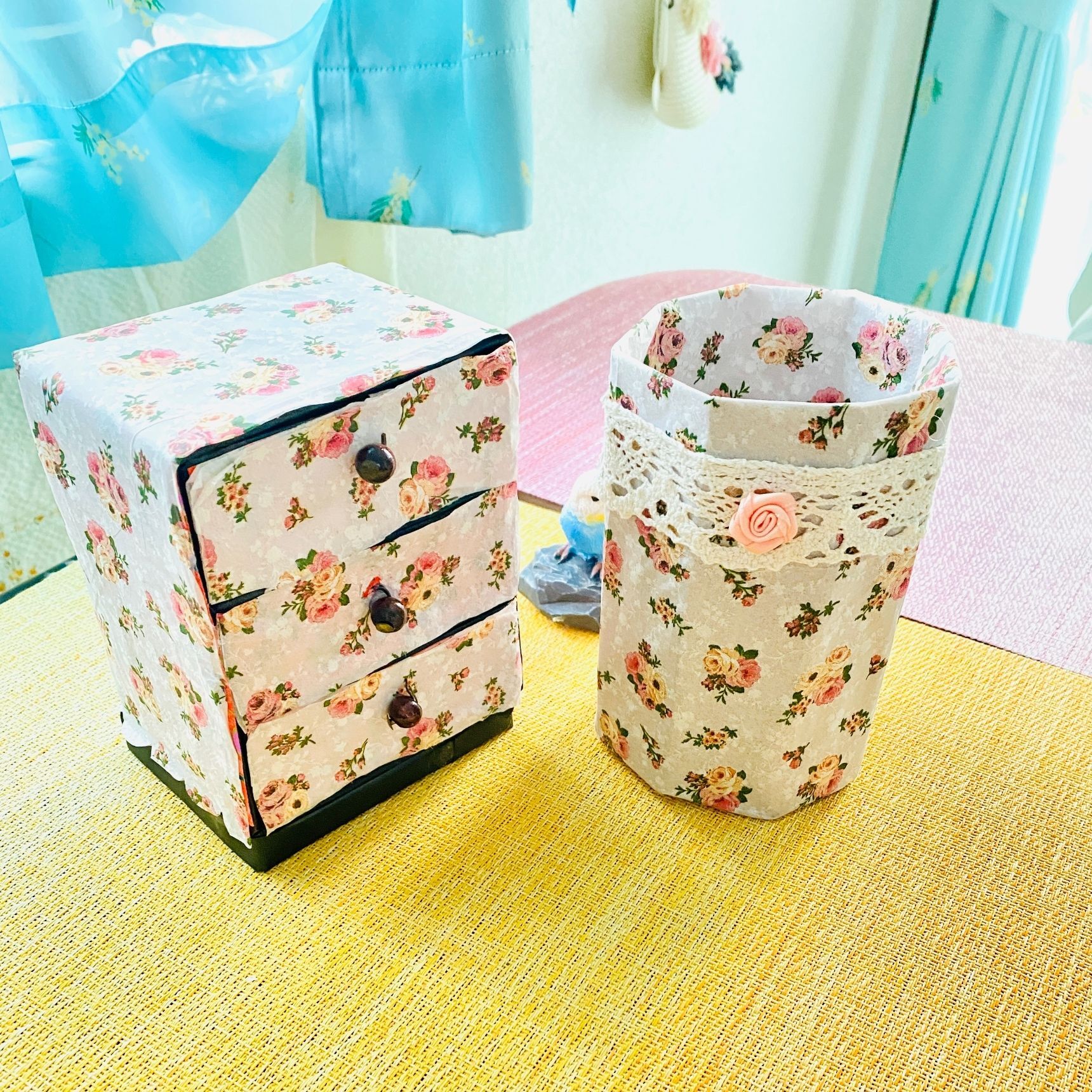 ローズ柄のペーパーナプキンを貼ってカルトナージュにしても素敵ですよ。