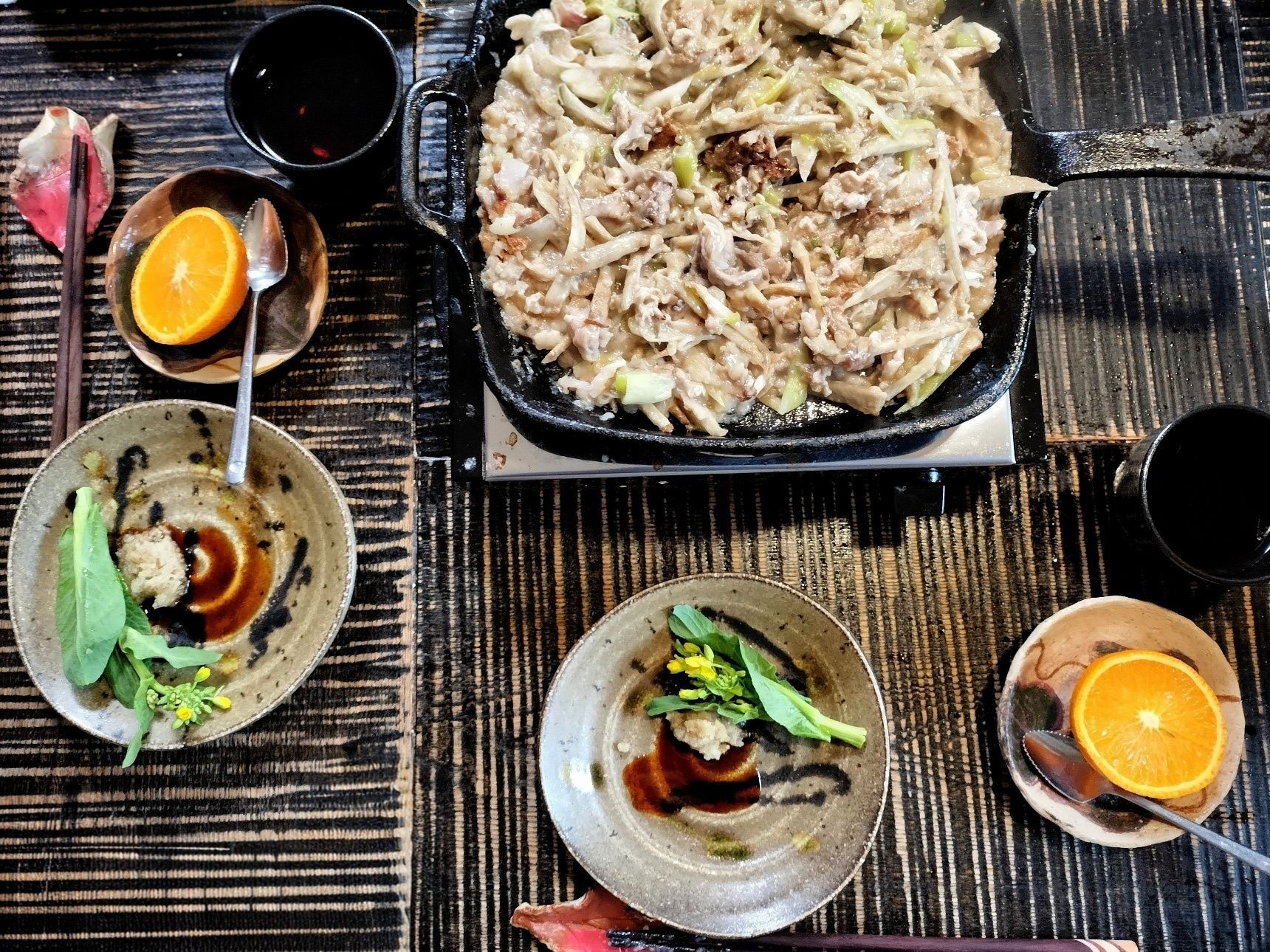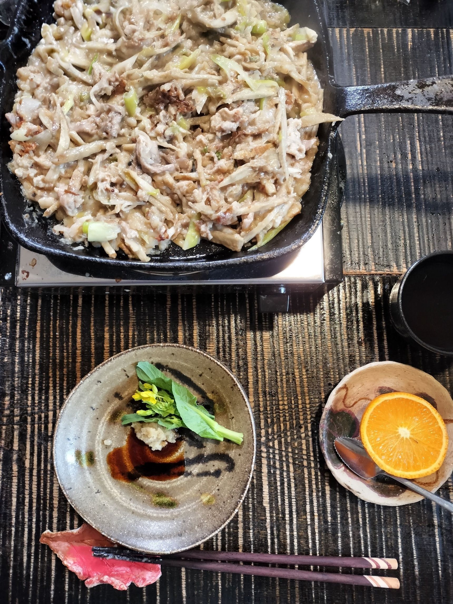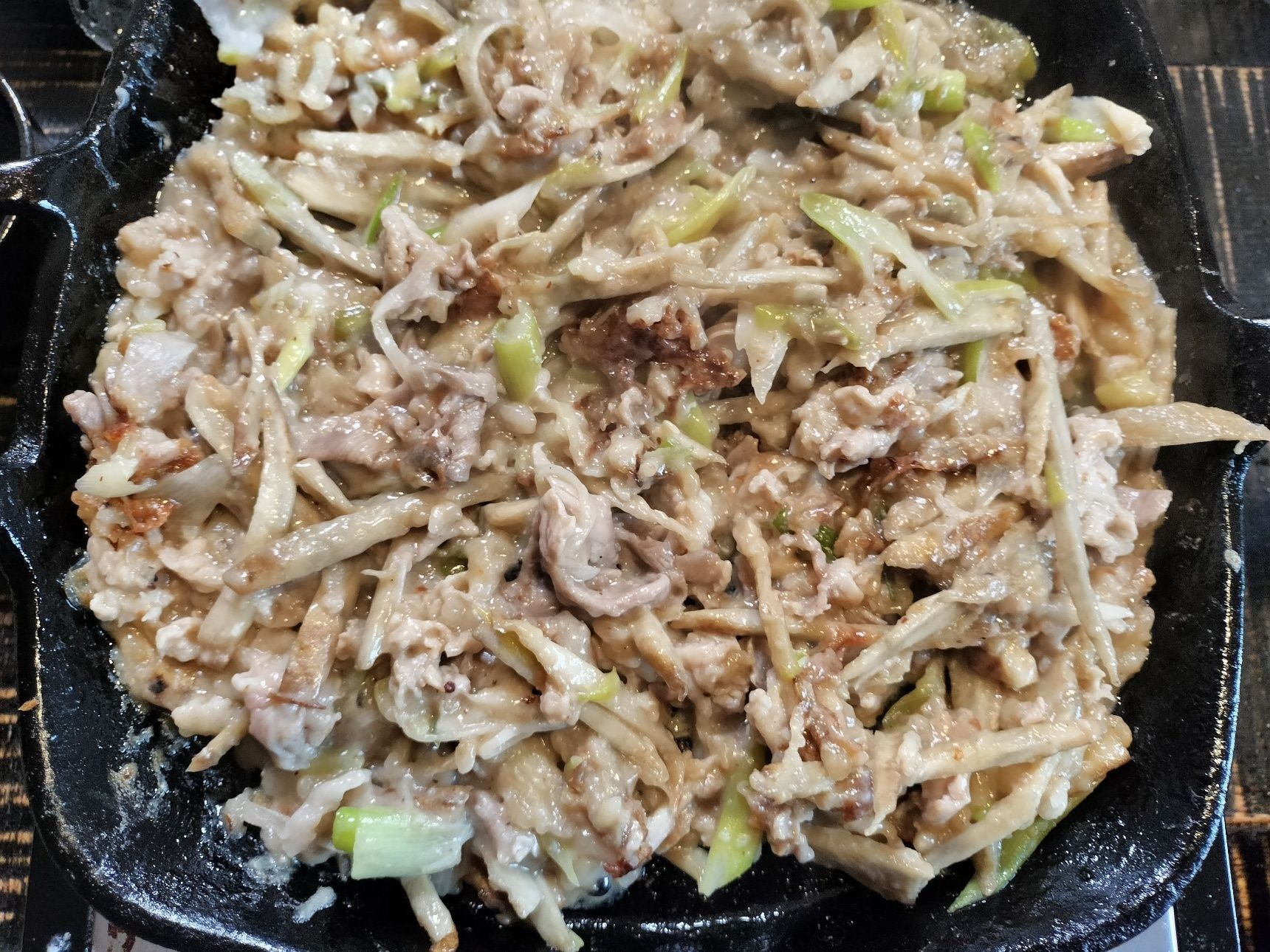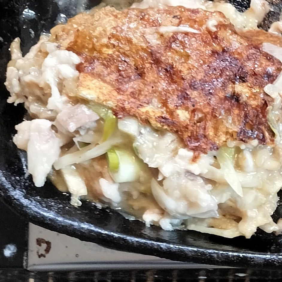 6. 鉄フライパン面の生地に焼き色が付いてきたら、ひっくり返して軽く混ぜる