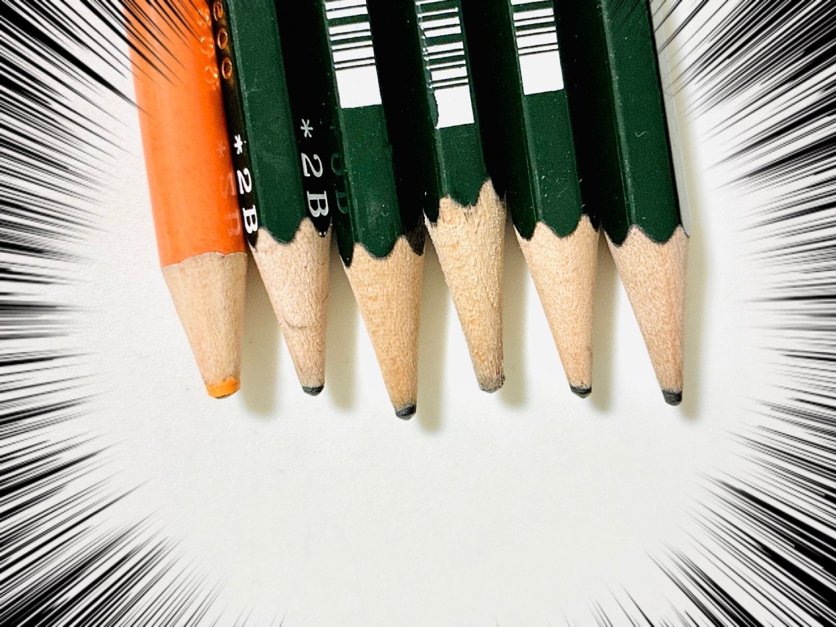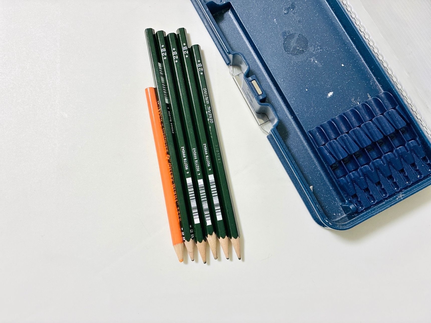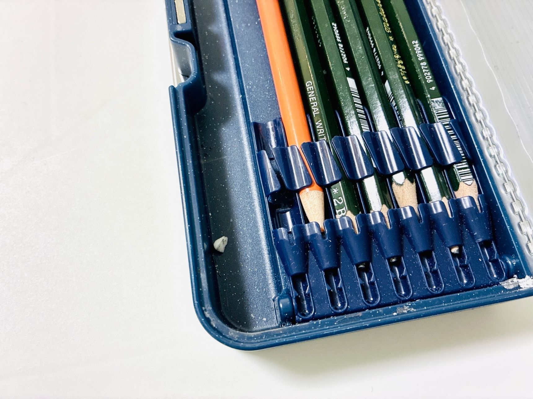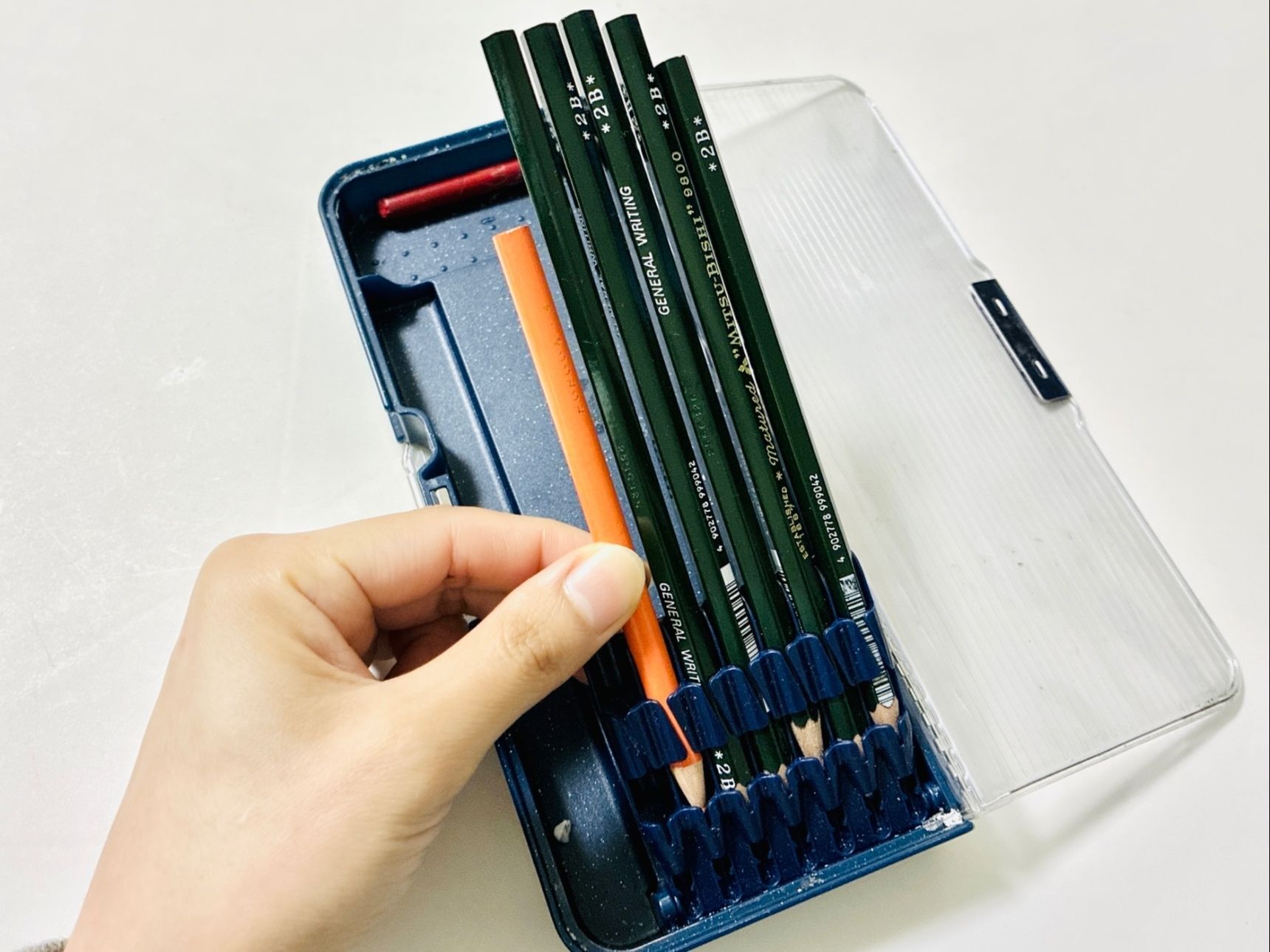 丸つけに必要な赤でも青でもなく、なぜかオレンジの色鉛筆が1本。