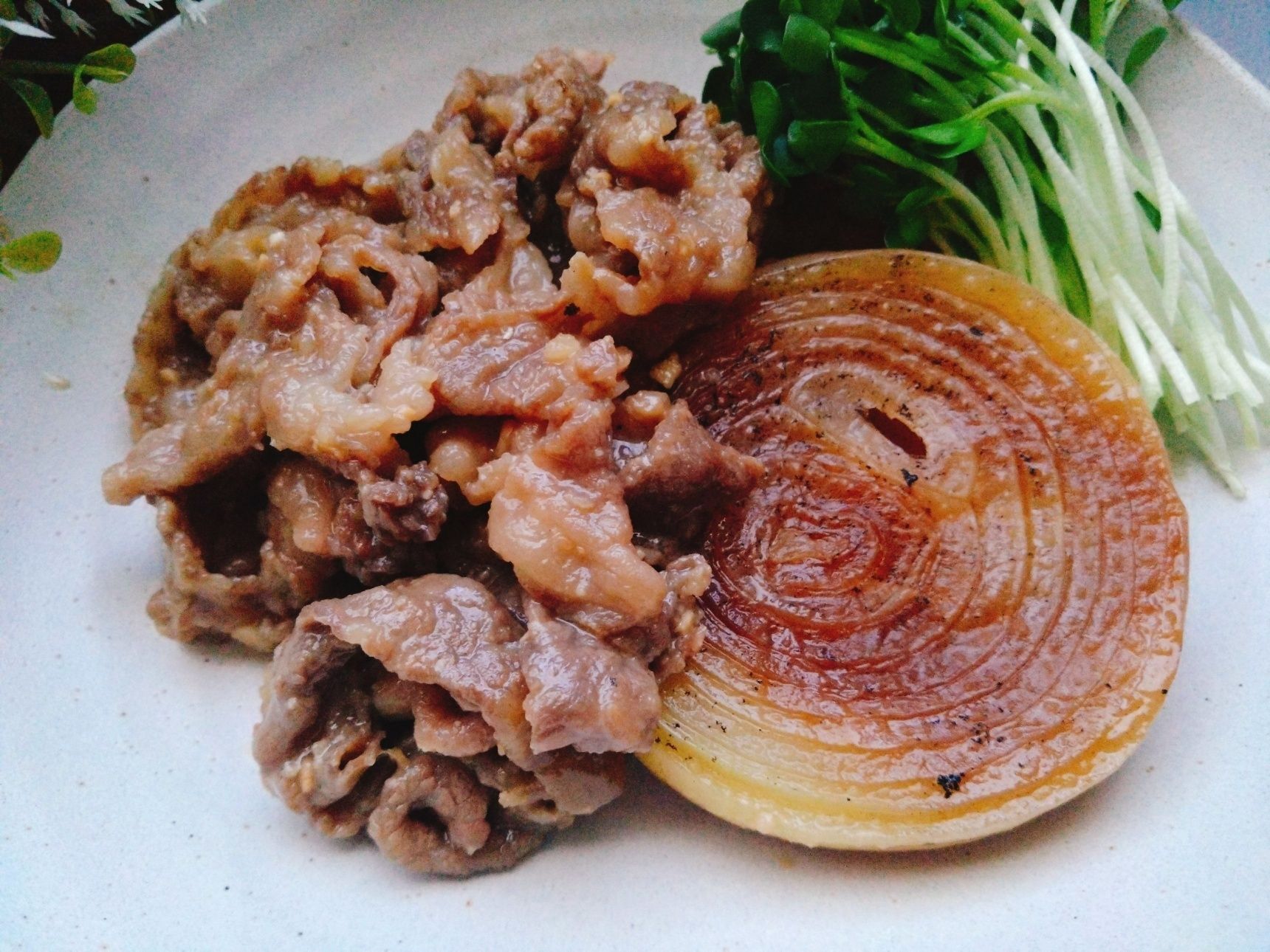 2.フライパンを拭き取り牛肉を入れてほぐしながら炒めたら、玉ねぎの上にかいわれ大根と盛り付けて完成