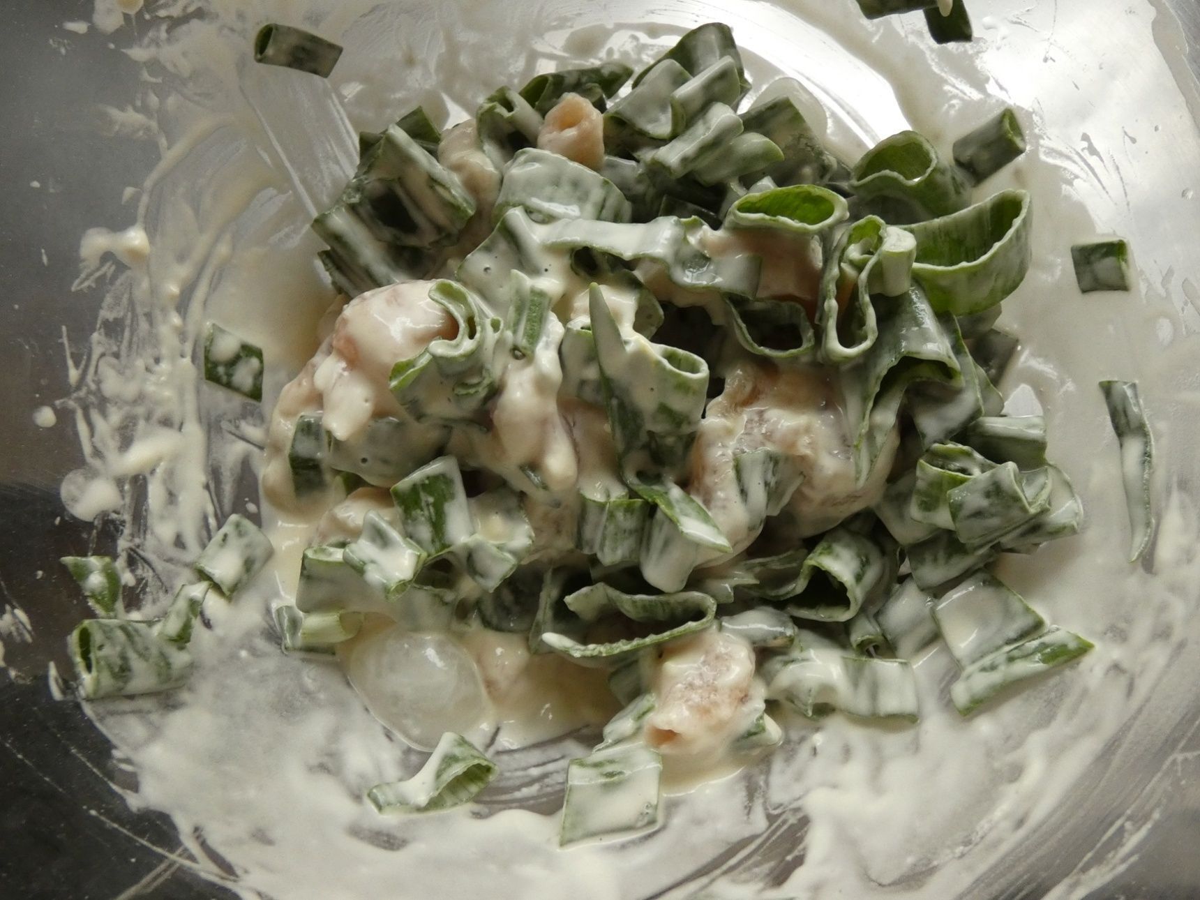 Aの材料をボウルに入れて混ぜ合わせ、ささみと新玉ねぎの葉を混ぜ合わせます。