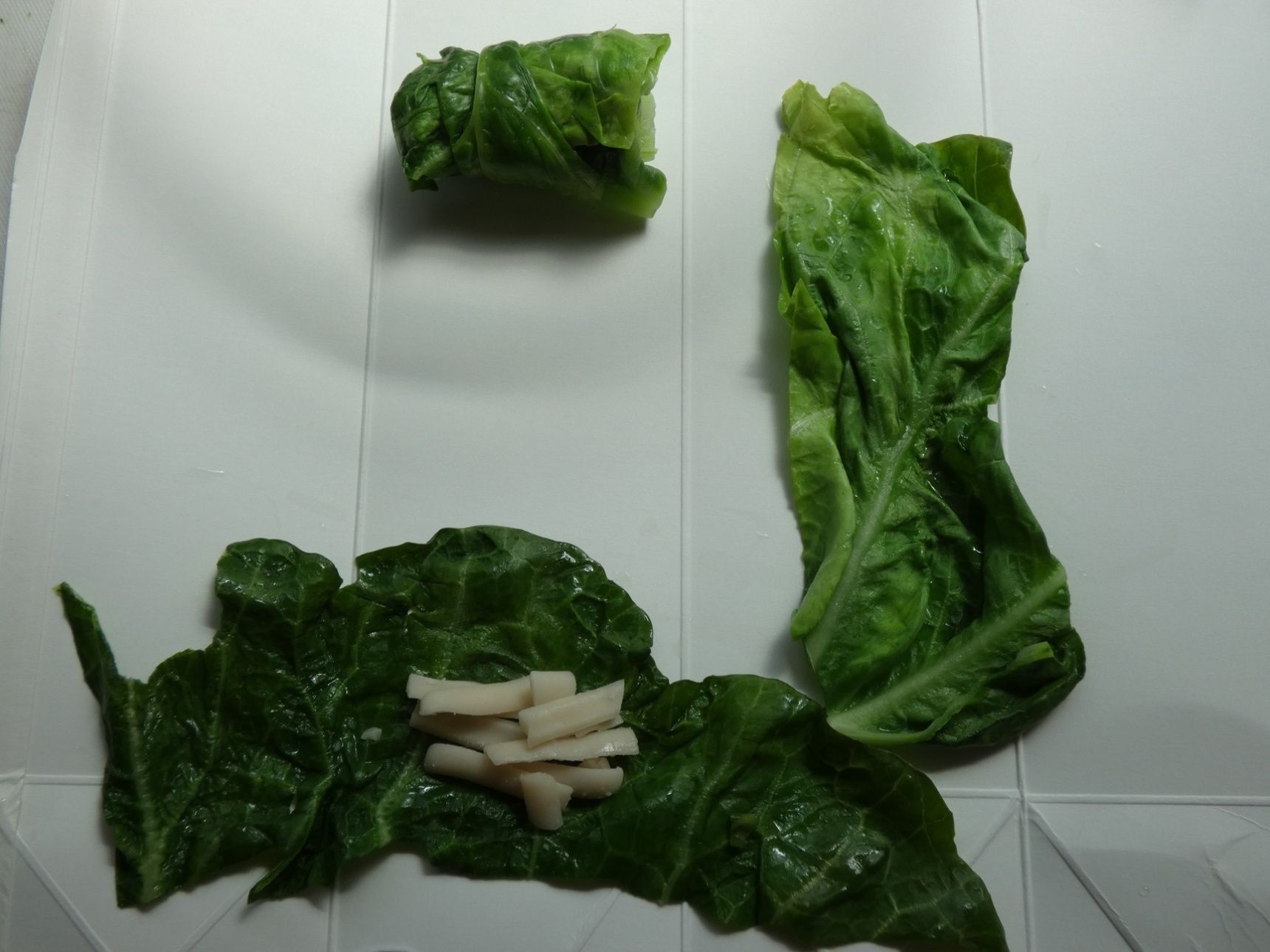 1枚目のキャベツでチーズを巻き、チーズが溶け出ないように2枚目のキャベツを巻きます。