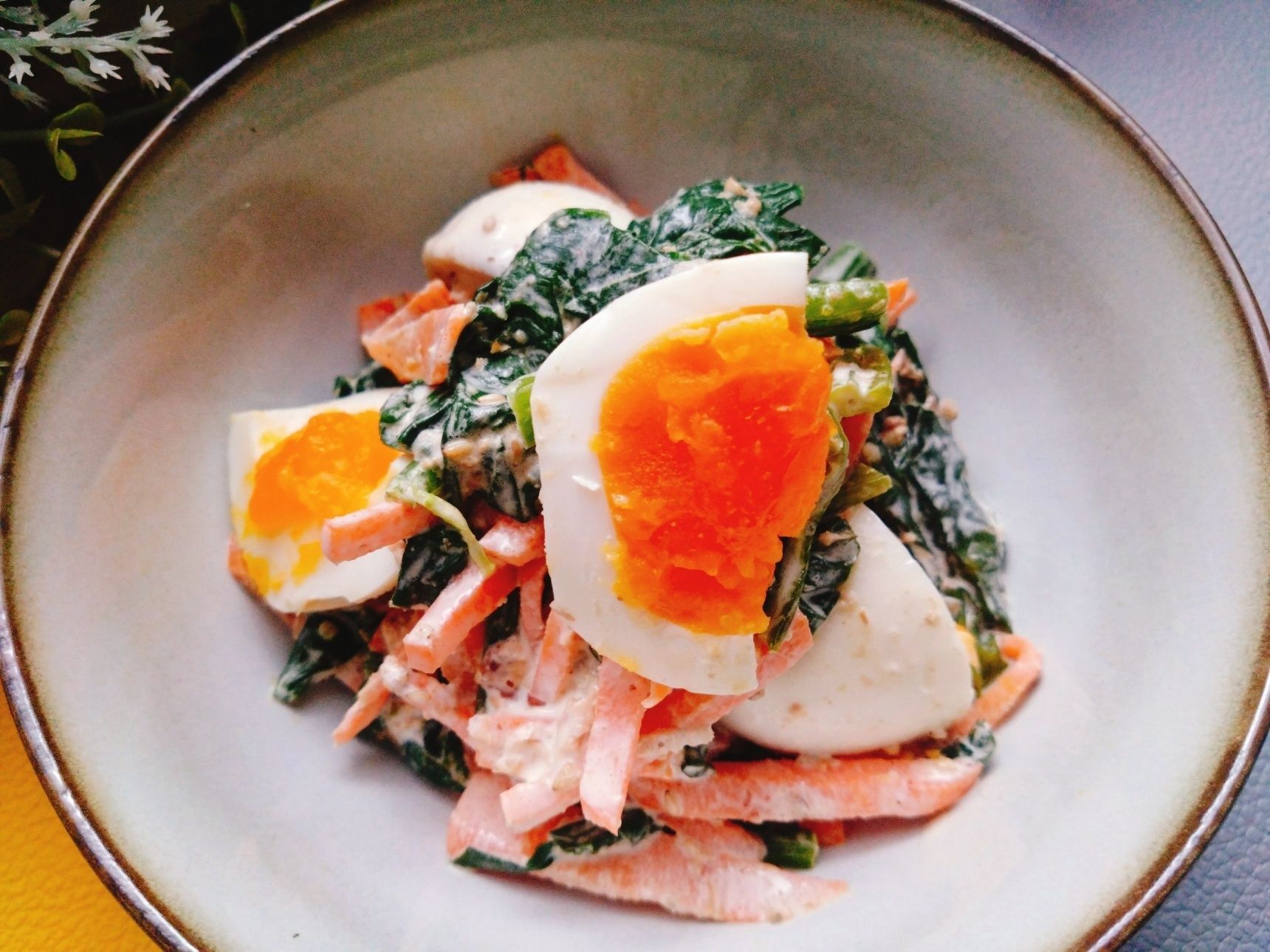 3.Bにゆで卵を入れてざっくりと潰したら、ほうれん草と人参を加えて全体を混ぜて完成