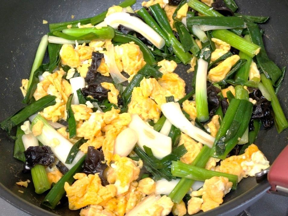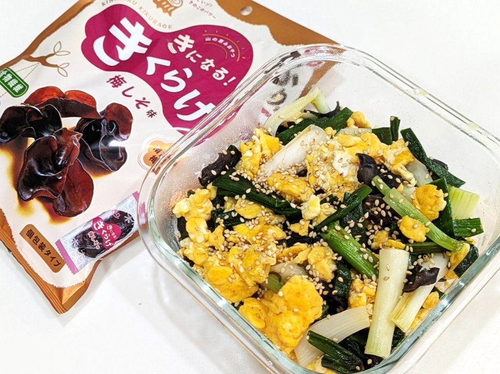 小口ねぎと炒り卵と【きになる!きくらげ】を炒めてみました。