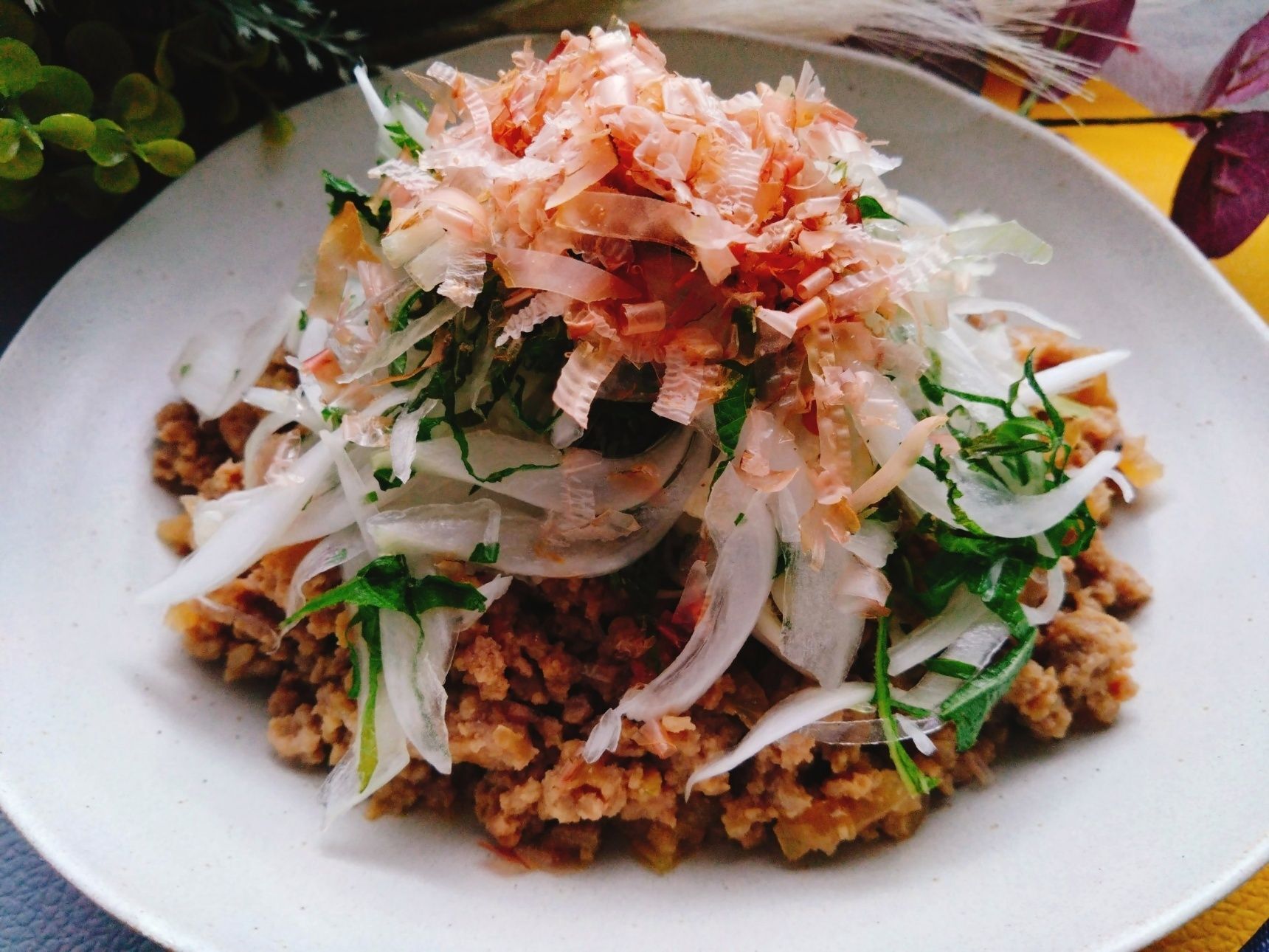 肉味噌のこってり感にシャキっと香りのいい玉ねぎと大葉の組み合わせ。