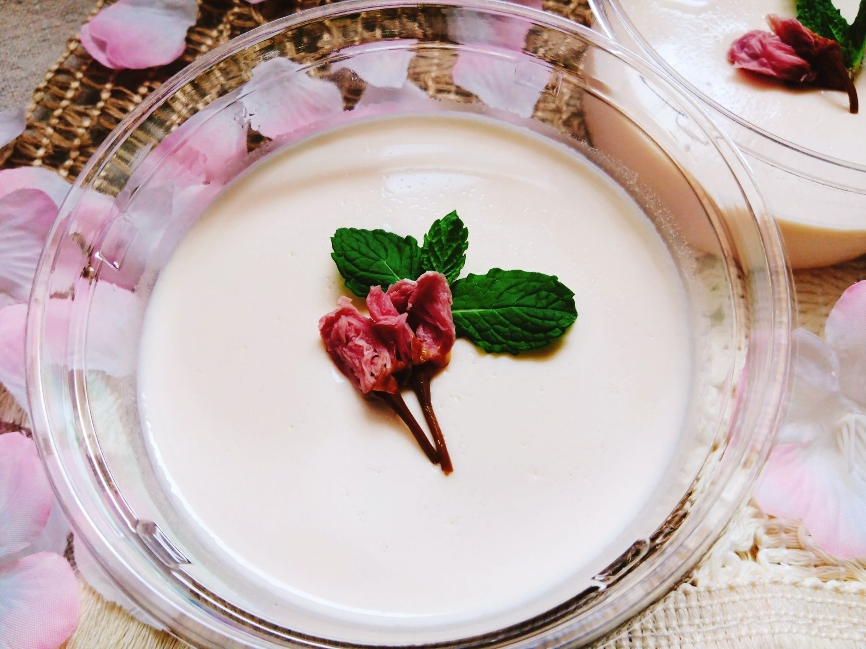 3.生クリームを加えてよく混ぜたら、カップに流し入れ3時間以上冷やす。桜の花びらとミントを飾って完成