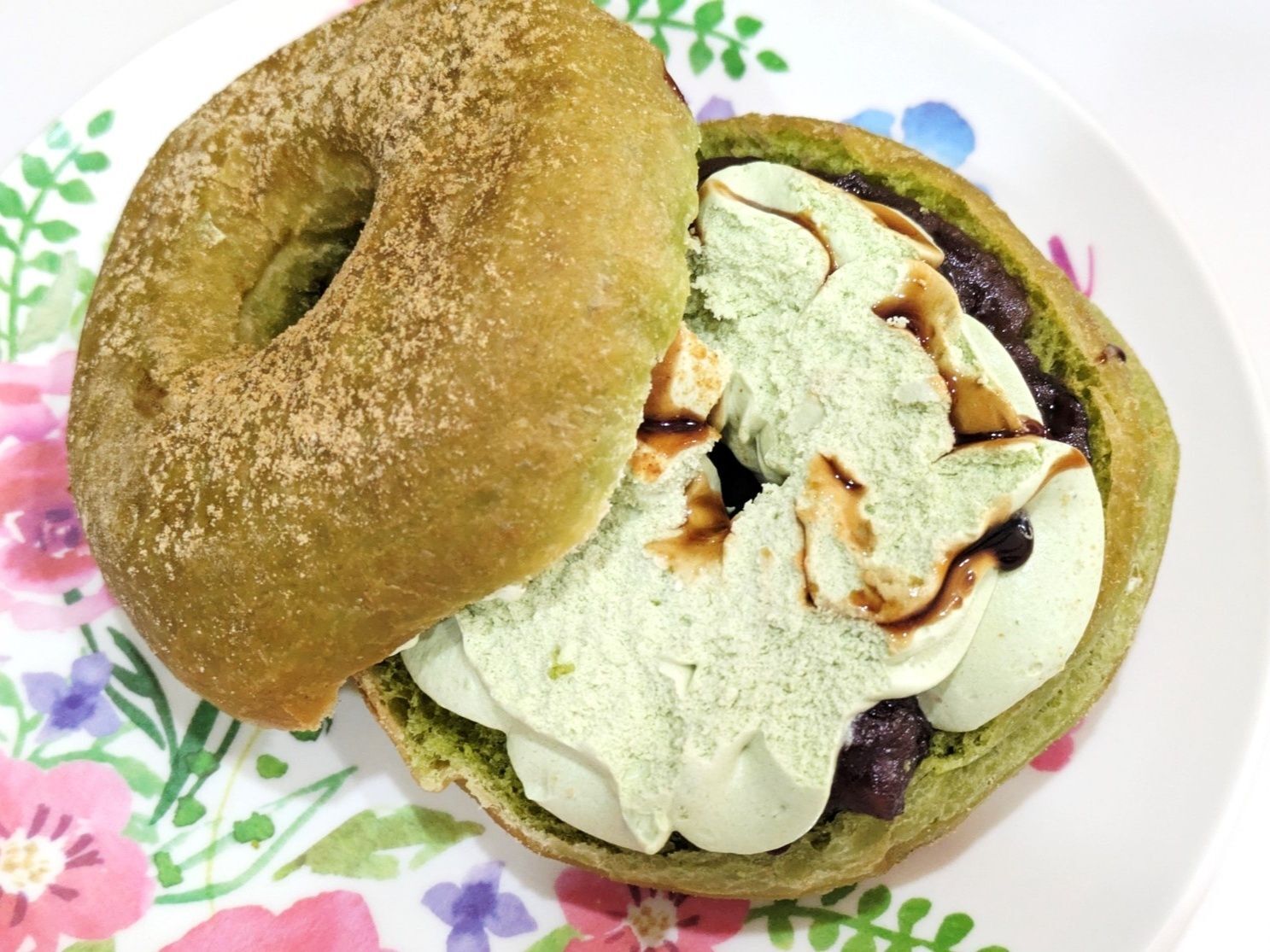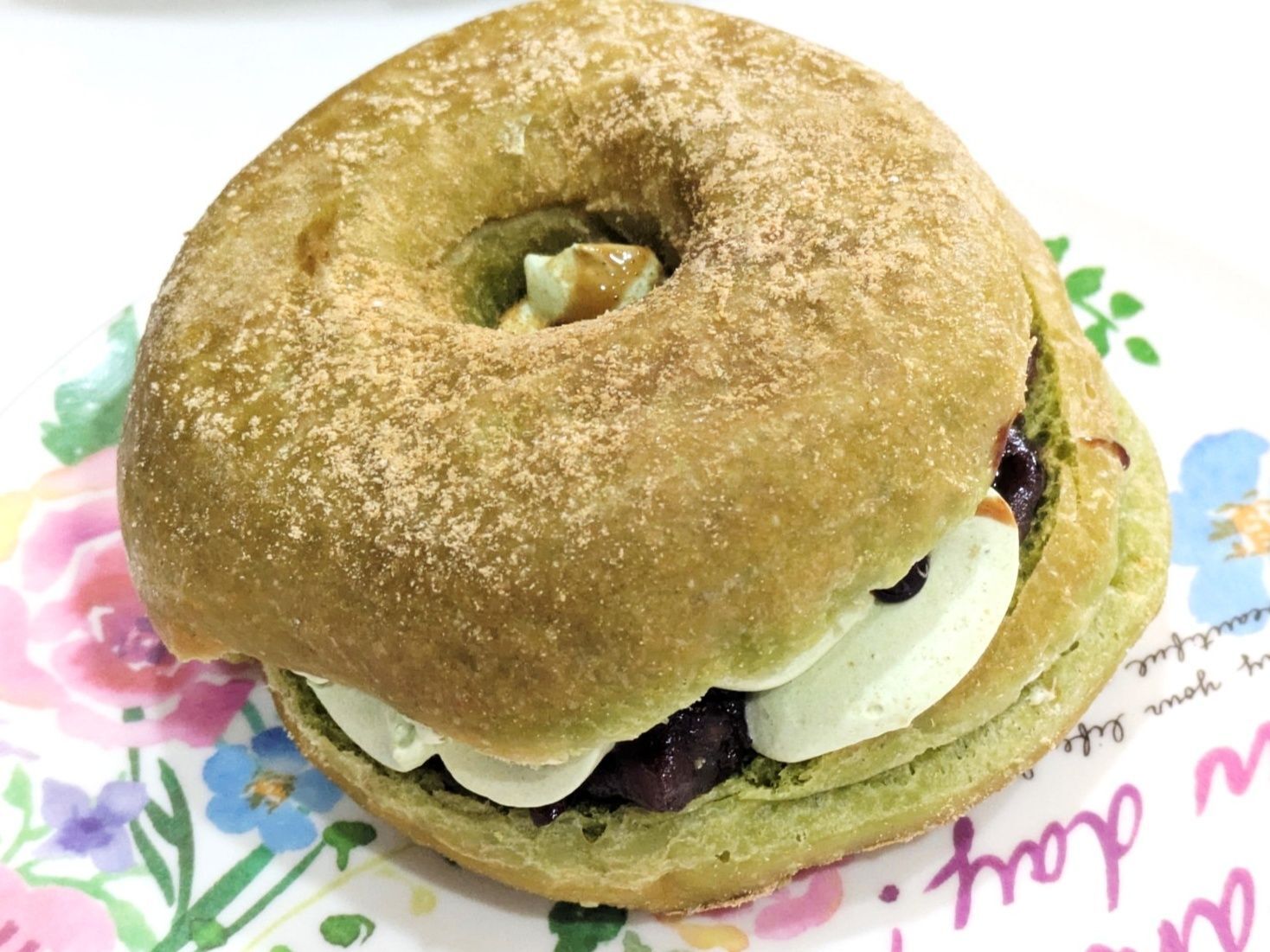 北海道あずきあんとふんわり滑らかな宇治抹茶ホイップがサンドされ、さらに黒みつもかかっています!抹茶の和のテイストにホッコリしちゃいます