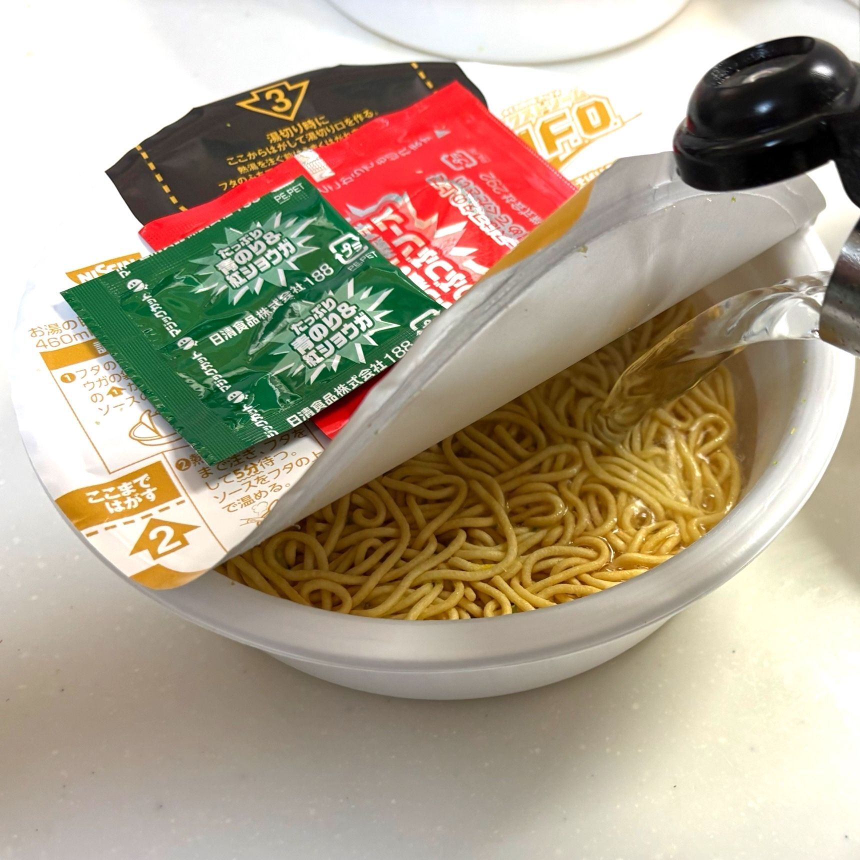 湯戻し時間は通常3分のところ、エクストリームUFOは5分。