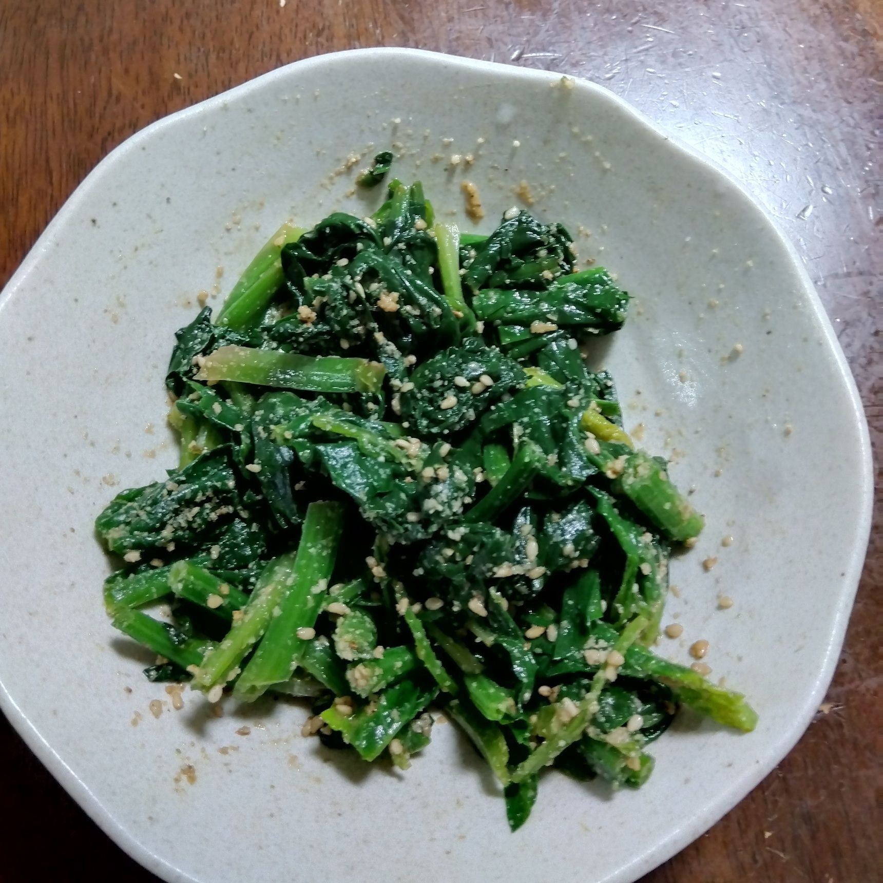 ほうれん草を葉と茎に分けます。 葉 30秒、茎 1分茹で、調味料を和えます。