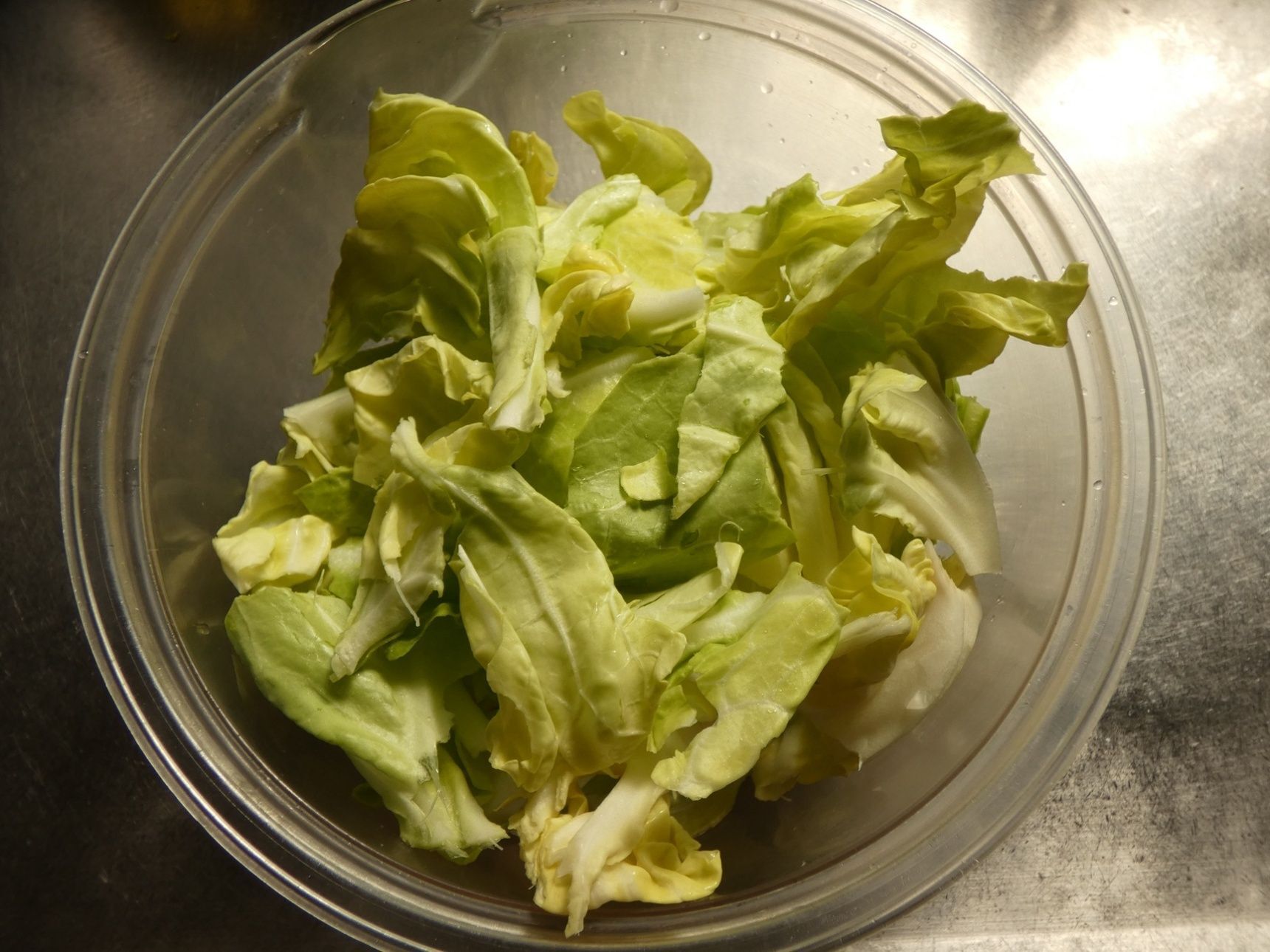 キャベツは食べやすい大きさに手でちぎります。耐熱容器に入れてふんわりラップをし、電子レンジ600Wで1分半加熱します。