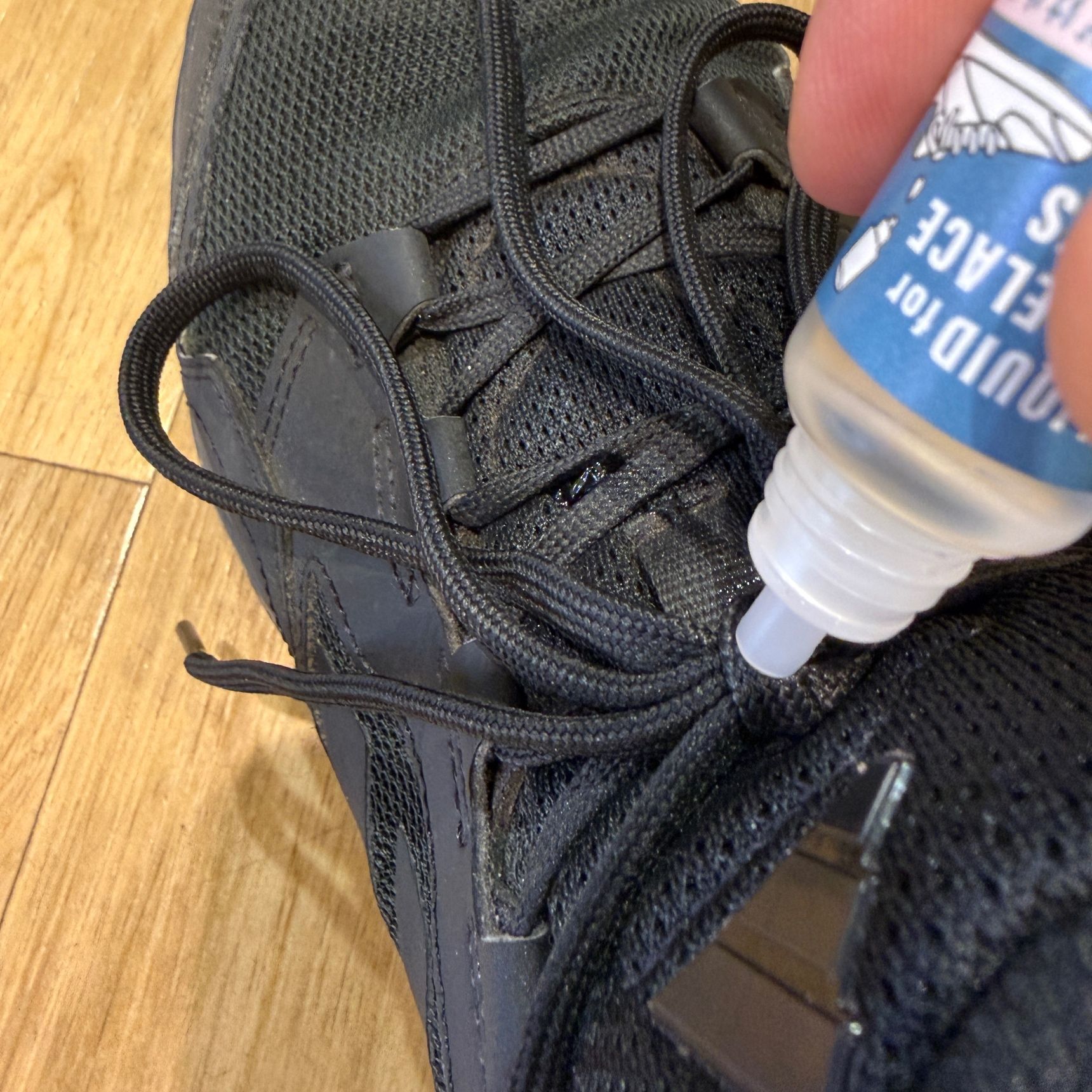 使い方はとても簡単で、結んだ靴紐の結び目に液を垂らして乾かすだけ。乾燥の目安は1時間程度だそうです。