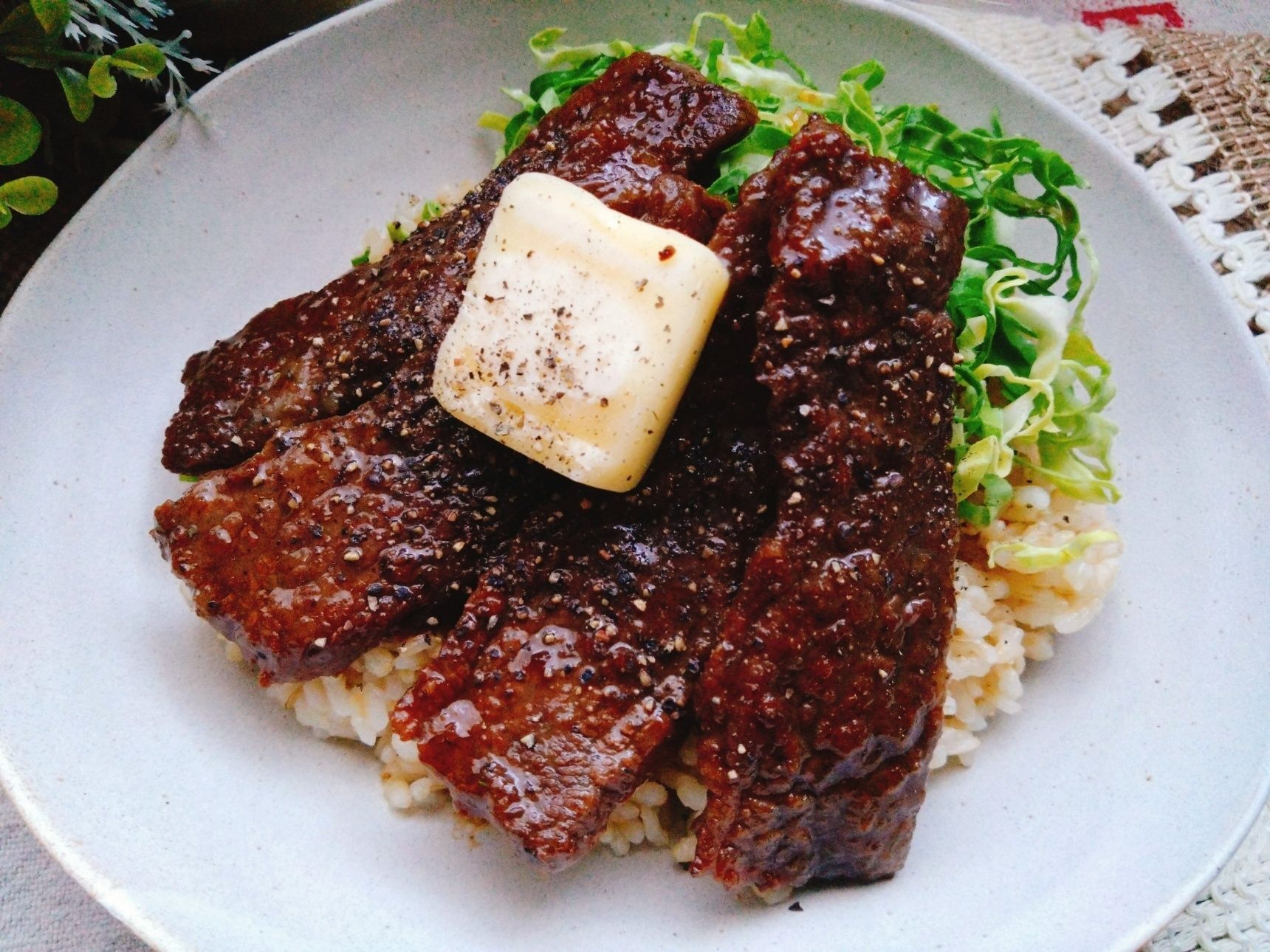 作り方 1.フライパンを熱し牛肉を片面焼いて裏返したらAを加えて照りが出るまで絡める 2.ご飯を盛り付けて肉とタレをのせたらブラックペッパーを多めに振り、バターをのせて完成