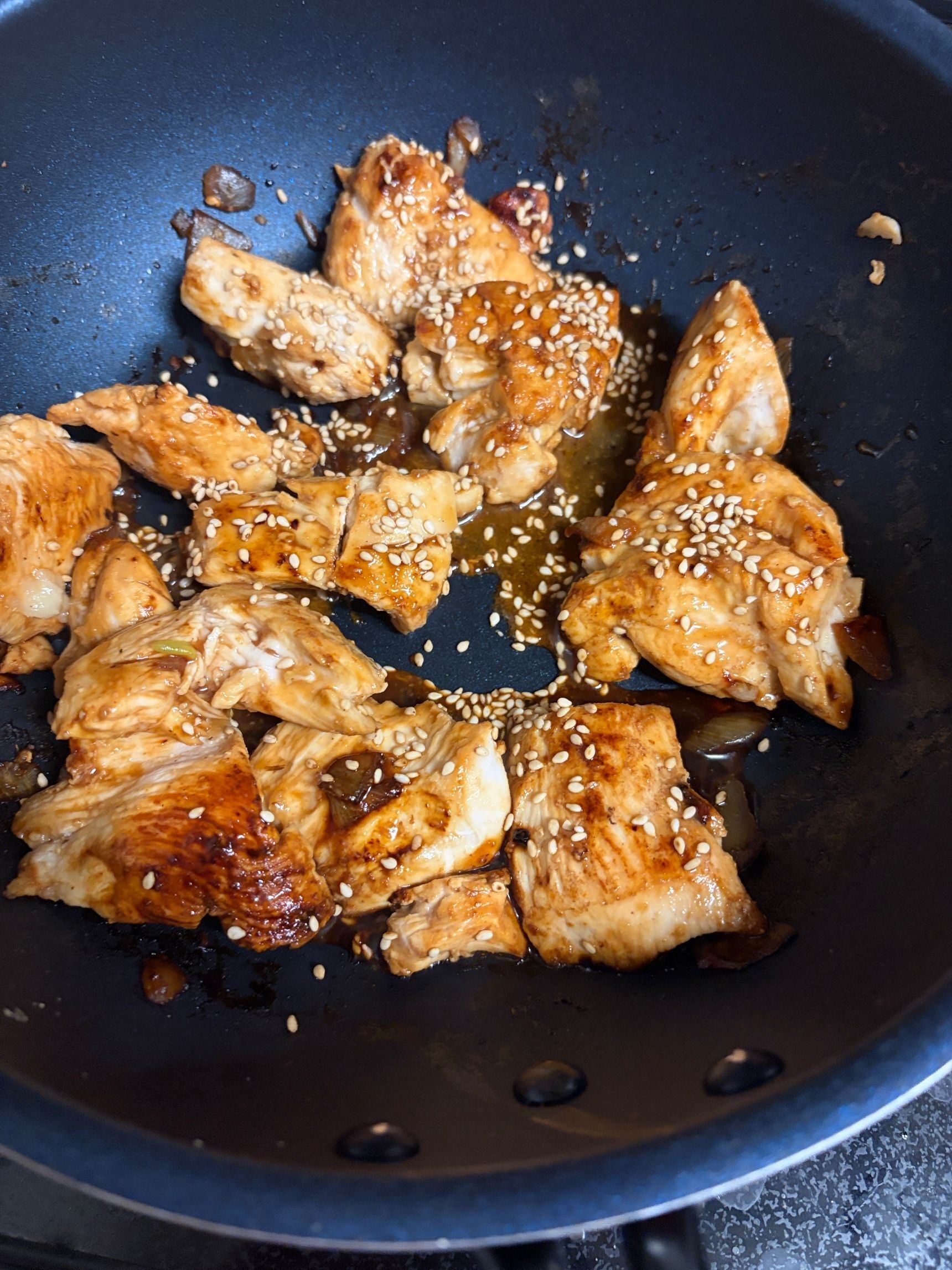 白いご飯の上に鶏胸肉のごま味噌焼きをたっぷりのせるので、ご飯はひえかめに入れてください。タレも染み込んでご飯も美味しく召し上がれると思います。ぜひ作ってみてね。