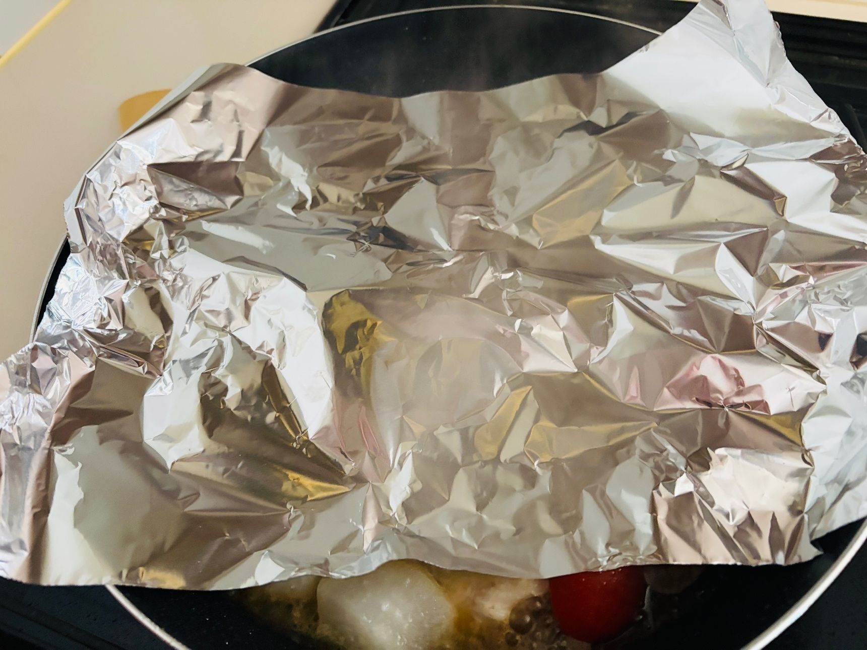 アルミ蓋をしながら煮ますが、時々、外して、お玉で煮汁をかけてください。材料に火が通ったら、半分にカットしたミニトマトを入れます。オリーブオイルをたっぷり回しかけます。