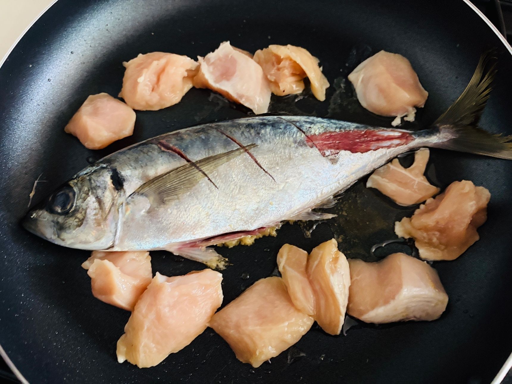 香りが出てきたら、下処理したあじを入れます。