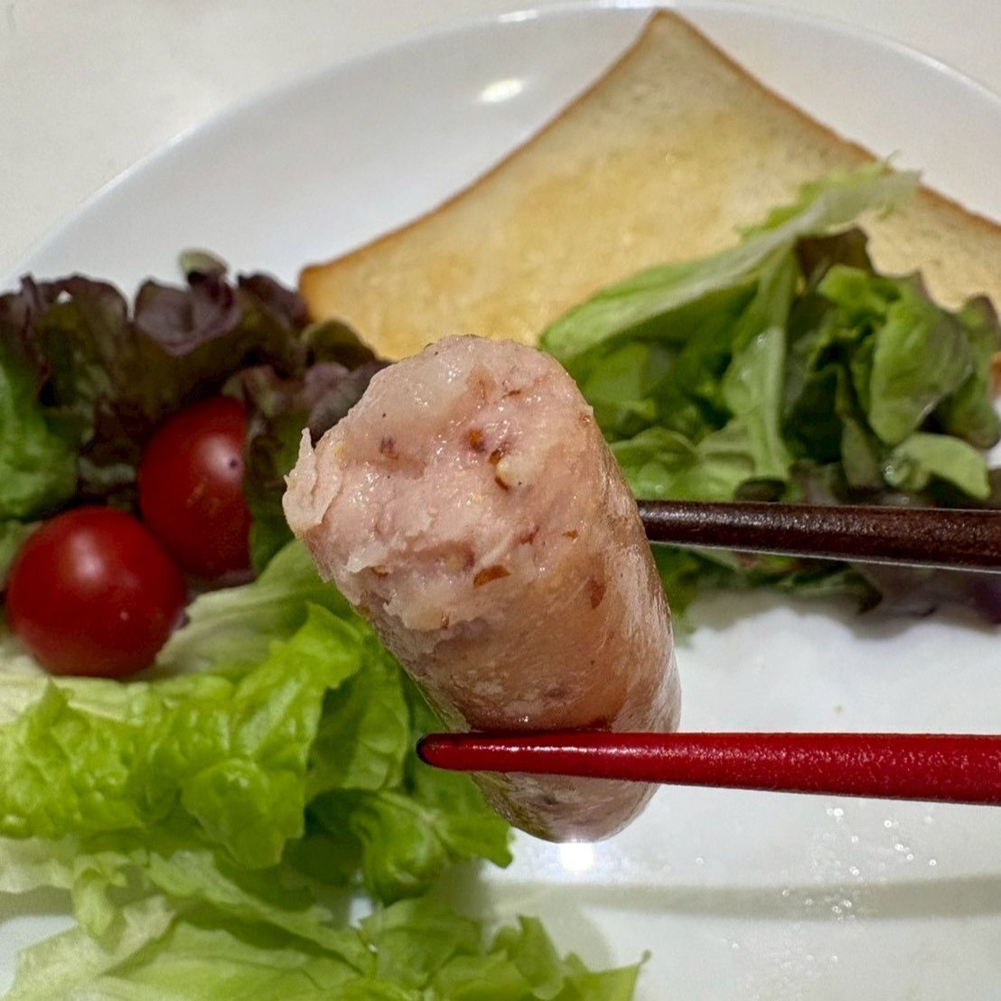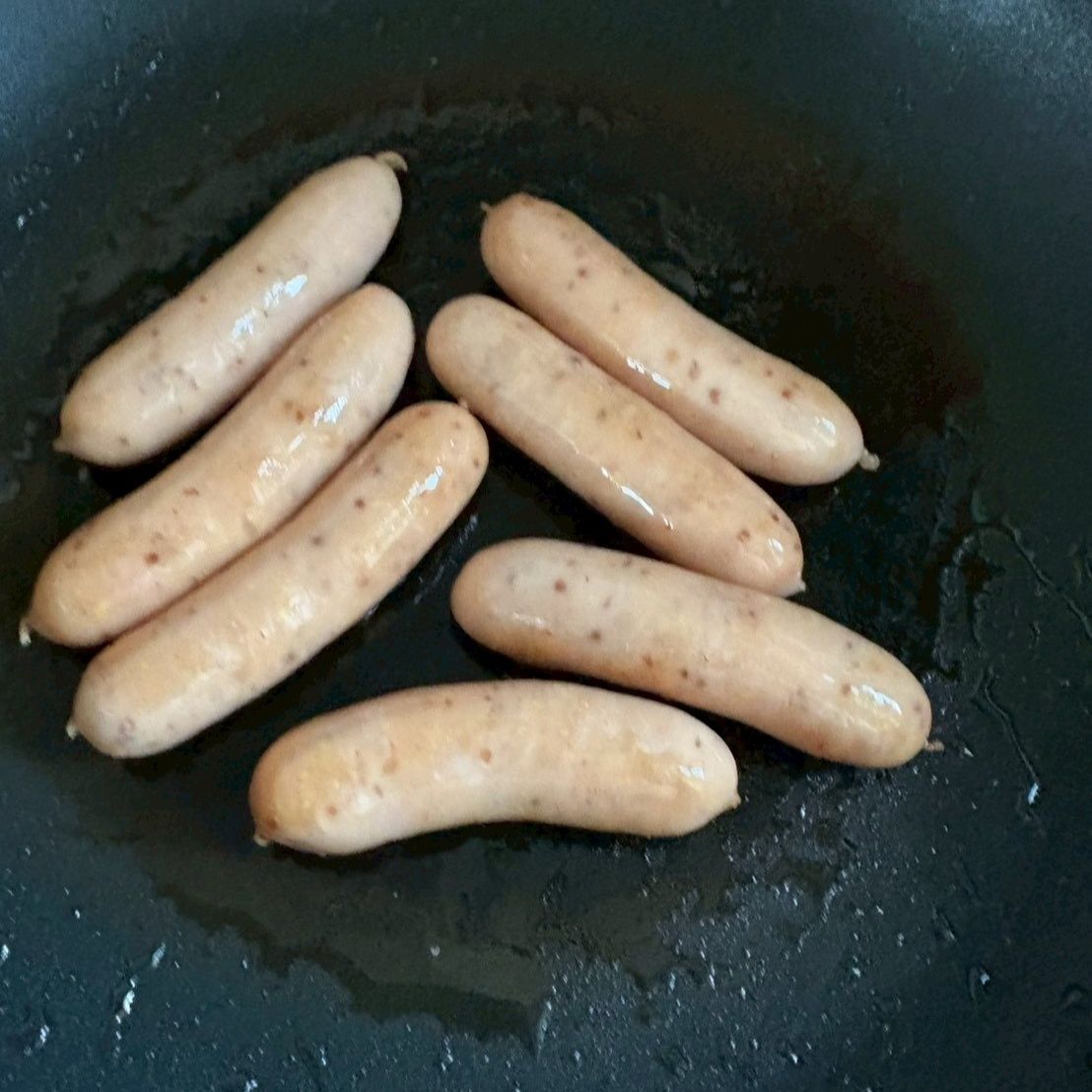 見たところは普通。ちょっとマスタードの粒が見えるくらいの白っぽいソーセージです。