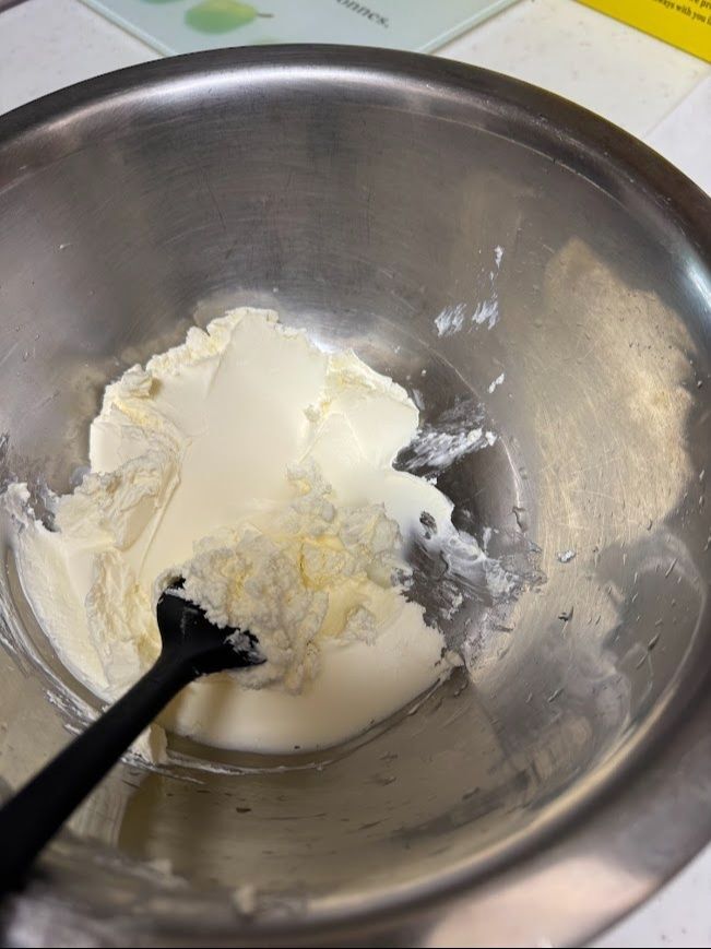 クリームチーズとバターを室温に戻してボウルに入れてクリーム状になるまで混ぜます。